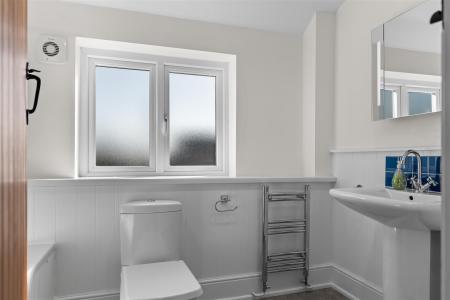 Main Bathroom - 2.77m x 1.98m (9'1" x 6'6") - Well appointed with a modern suite comprising panelled bath with chrome taps and further wall mounted shower, close coupled WC and pedestal washbasin, contemporary towel radiator, tongue and groove effect splash backs, built in cupboard and double glazed window.