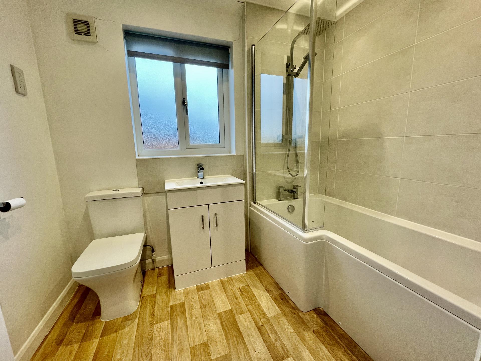 RECENTLY REFITTED FAMILY BATHROOM 5' 10" x 7' 11" (1.79m x 2.42m) Obscured UPVC double glazed window to the rear elevation, skimmed and coved ceiling, inset LED lighting, stainless steel heated towel rail, extractor fan, shaver point. Fitted with a three piece suite comprising low level WC, wash hand basin fitted into vanity unit with mixer tap, 'P' shaped bath with rainfall shower mixer tap and fitted thermostatic shower over with rainfall shower head and further shower attachment tap.