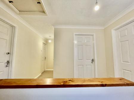 FIRST FLOOR GALLERIED LANDING 7' 10" x 9' 10" (2.39m x 3.02m) UPVC double glazed window to the side elevation, coved and textured ceiling, centre light point, smoke alarm, access to loft space, electric storage heater, storage cupboard off housing hot water cylinder with slatted shelving, door into: