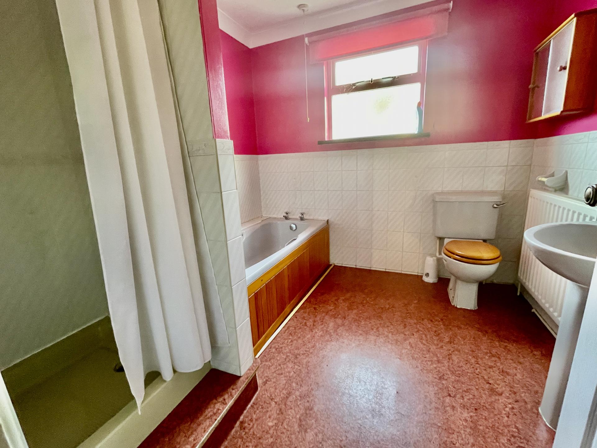 FAMILY BATHROOM 8' 1" x 8' 5" (2.48m x 2.59m) Obscured UPVC double glazed window to the side elevation, skimmed and coved ceiling, centre light point, extractor fan, part tiled walls, radiator, fitted with a four piece suite comprising low level WC, pedestal wash hand basin with mixer tap, bath with taps, fully tiled shower enclosure with fitted Mira shower over.