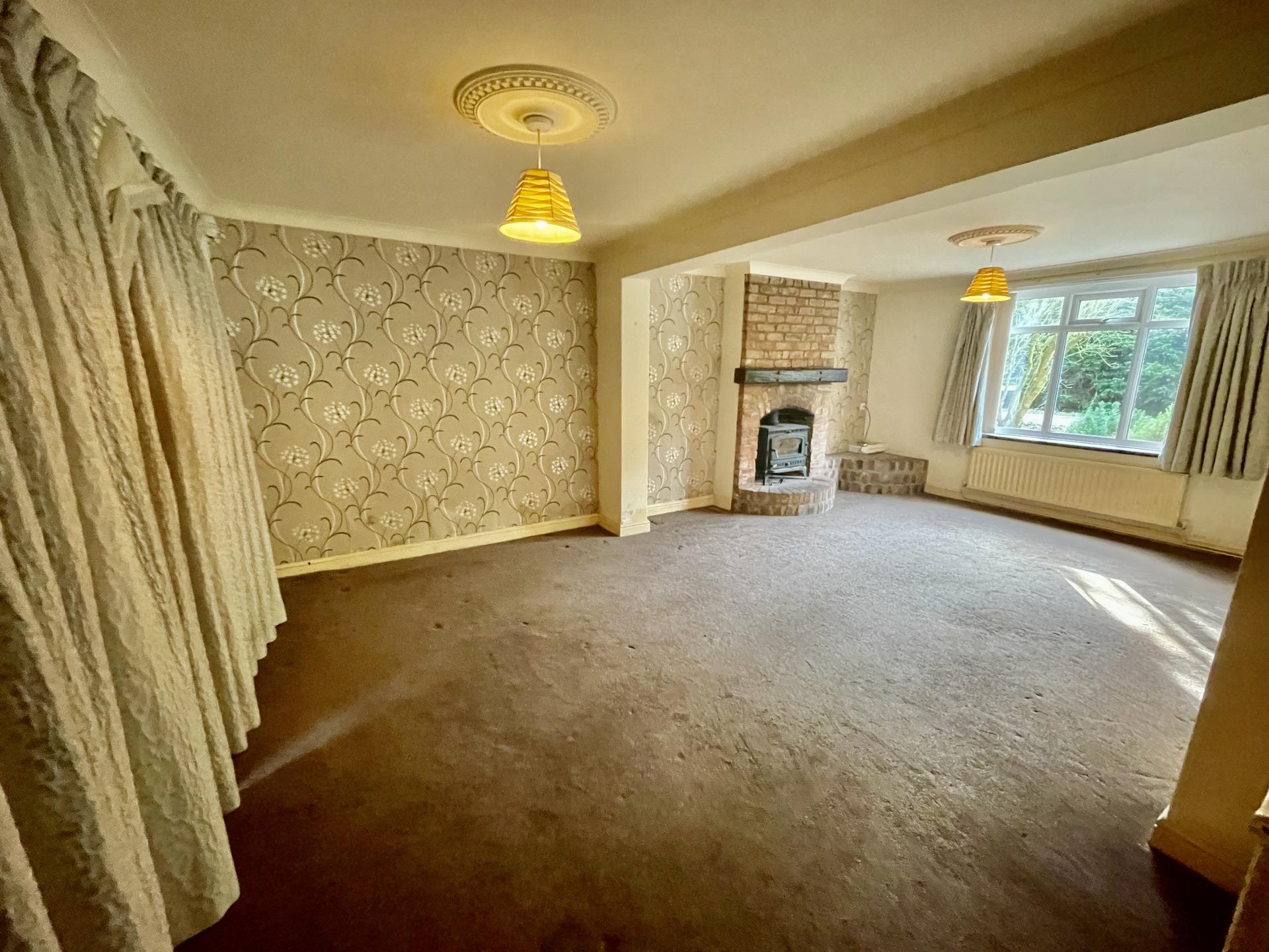 LOUNGE 18' 2" x 20' 9" (5.54m x 6.33m) UPVC double glazed window to the front elevation, skimmed and coved ceiling, 2 centre light points, decorative ceiling rose, smoke alarm, 3 radiators, TV point, feature Inglenook fireplace with oak mantle with fitted multi fuel burner stove, UPVC double glazed French doors to the rear elevation with matching glazed panels to the side.