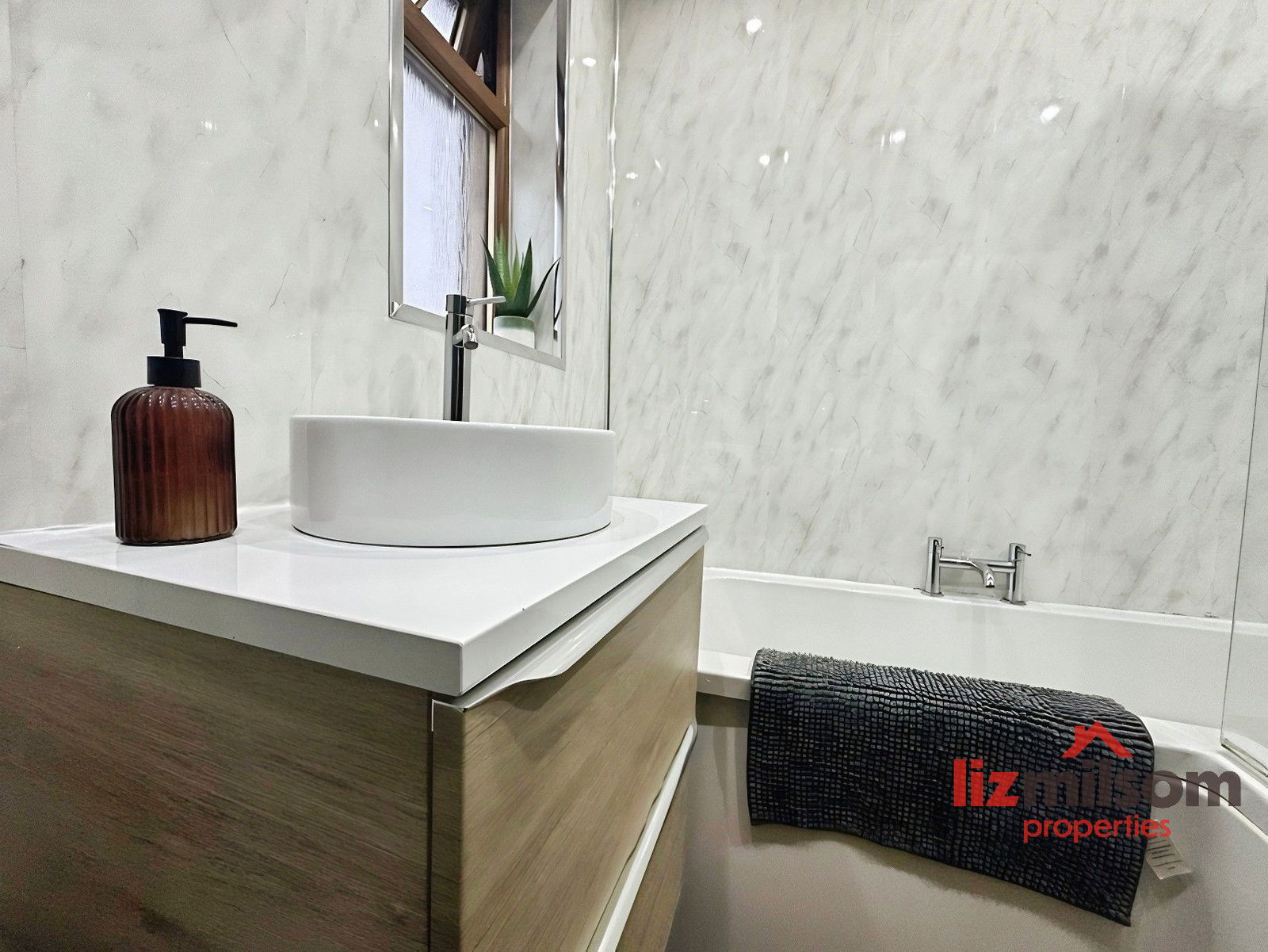 The modern family bathroom is finished to a high standard, fully tiled and fitted with a three-piece suite comprising a panelled bath with shower over, wash hand basin, and low-level WC. A double-glazed window to the rear provides natural light and ventilation.