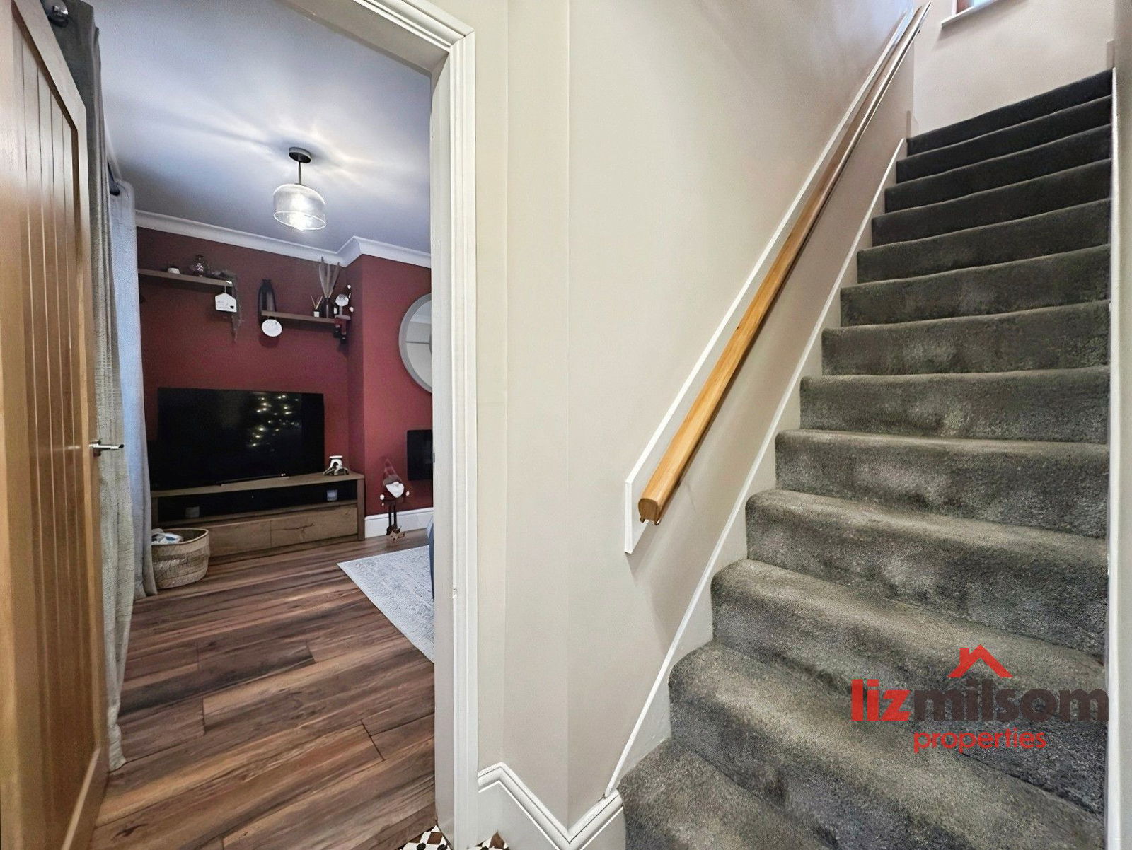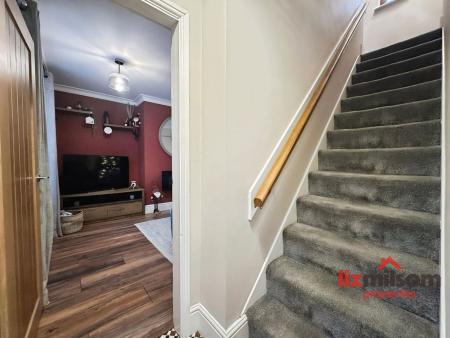 This well-presented home is entered through a welcoming entrance hallway, which provides access to the main living areas and stairs rising to the first floor. The lounge is a bright and inviting space, enhanced by dual-aspect windows that allow plenty of natural light to flow throughout the room. A wall-hung electric fire creates a warm focal point, complemented by a central light point, radiator, and TV connection, making it an ideal room for relaxing or entertaining.