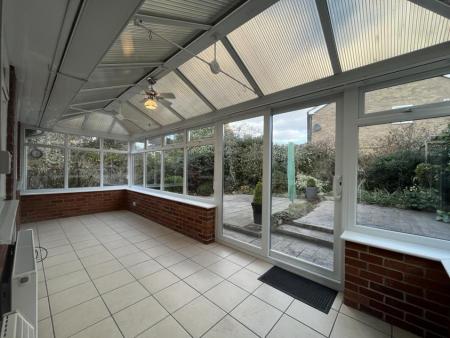 The property is set back from the road behind a small, low-maintenance walled fore-garden. Upon entering, the Reception Hallway provides access to all rooms and features wooden flooring, a centre light point, and a radiator. To the left is the spacious Lounge, which boasts a bay window to the front, complete with a fitted blind, an inset gas fire, carpeted flooring, two centre light points, and a radiator. Opposite the Lounge is Bedroom Two, a well-sized room with fitted mirrored wardrobes, carpeted flooring, a centre light point, and a radiator. At the rear of the property, the Breakfast Kitchen offers a range of country cottage-style wall and floor-mounted units, ample work surfaces, and an inset stainless steel sink and drainer. The kitchen also provides space and plumbing for appliances, tiled flooring, and an archway leading into the Dining Area. The delightful Conservatory, accessible through the Breakfast Kitchen, spans the full length of the rear of the property and features a ceiling fan with a light point, ceramic tiled flooring, a radiator, and doors opening onto the rear garden and patio. Bedroom One, located at the rear, is a spacious double with carpeted flooring, a centre light point, and a radiator. Completing the internal accommodation is the modern three-piece shower room, which includes a double shower with an inset mains shower, a low-level WC, and a pedestal wash hand basin, along with a useful storage cupboard, tiled flooring, and an opaque window to the side elevation.
