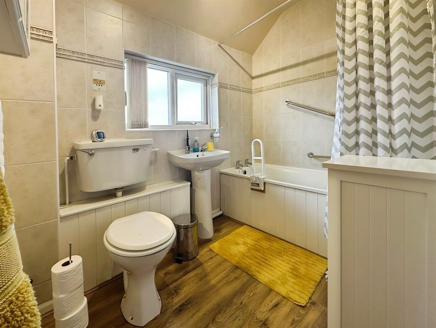 Completing the internal accommodation is the Family Bathroom, fitted with a three-piece white suite comprising a low level WC, pedestal wash hand basin, and panelled bath with mains shower over.