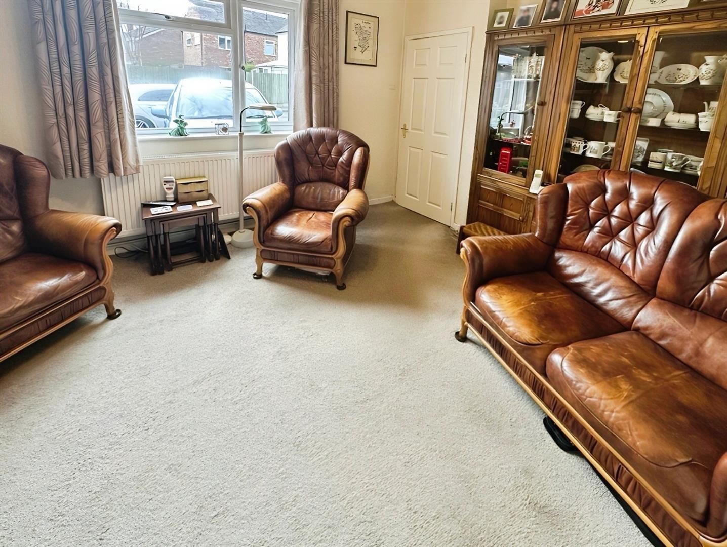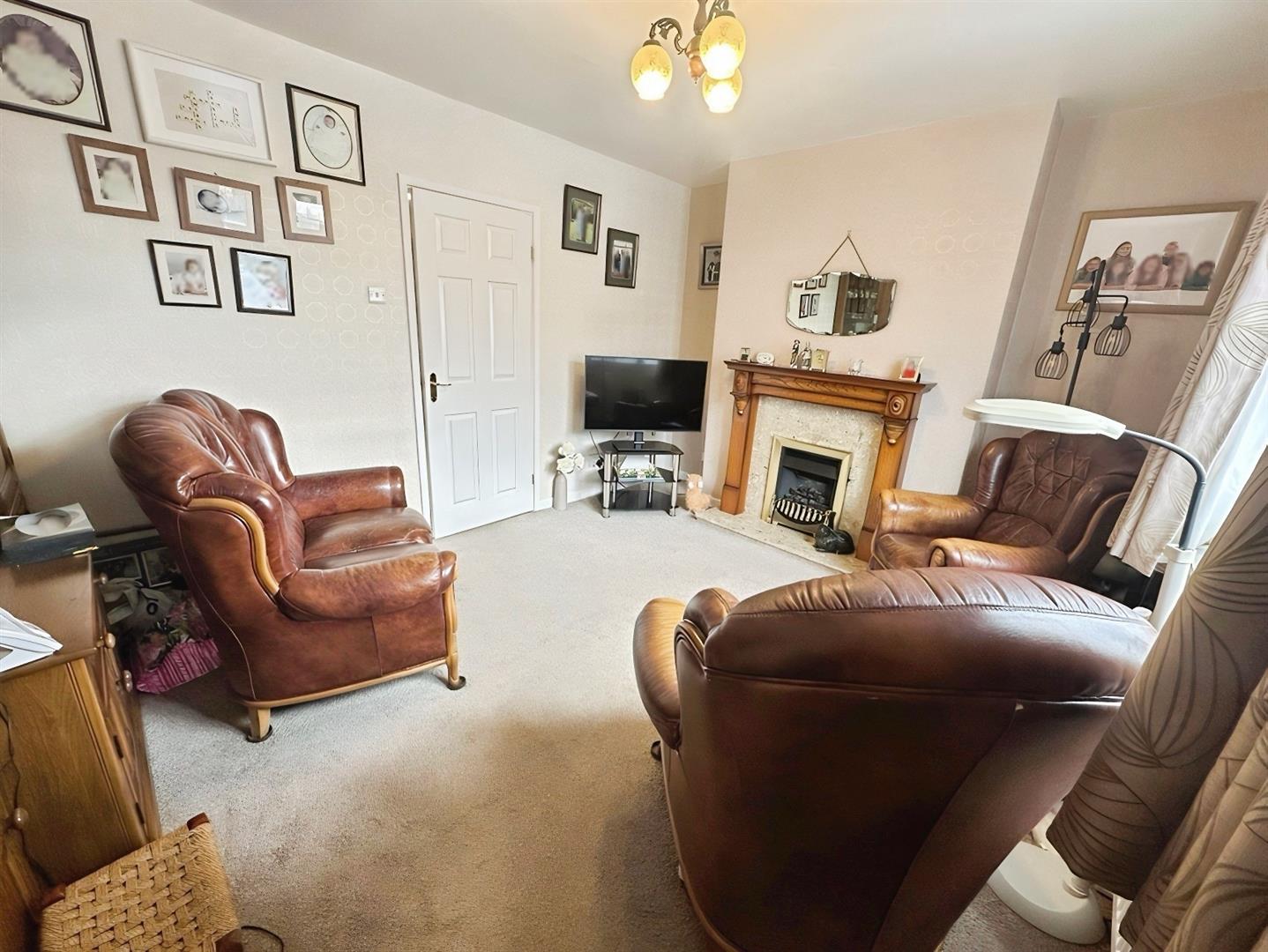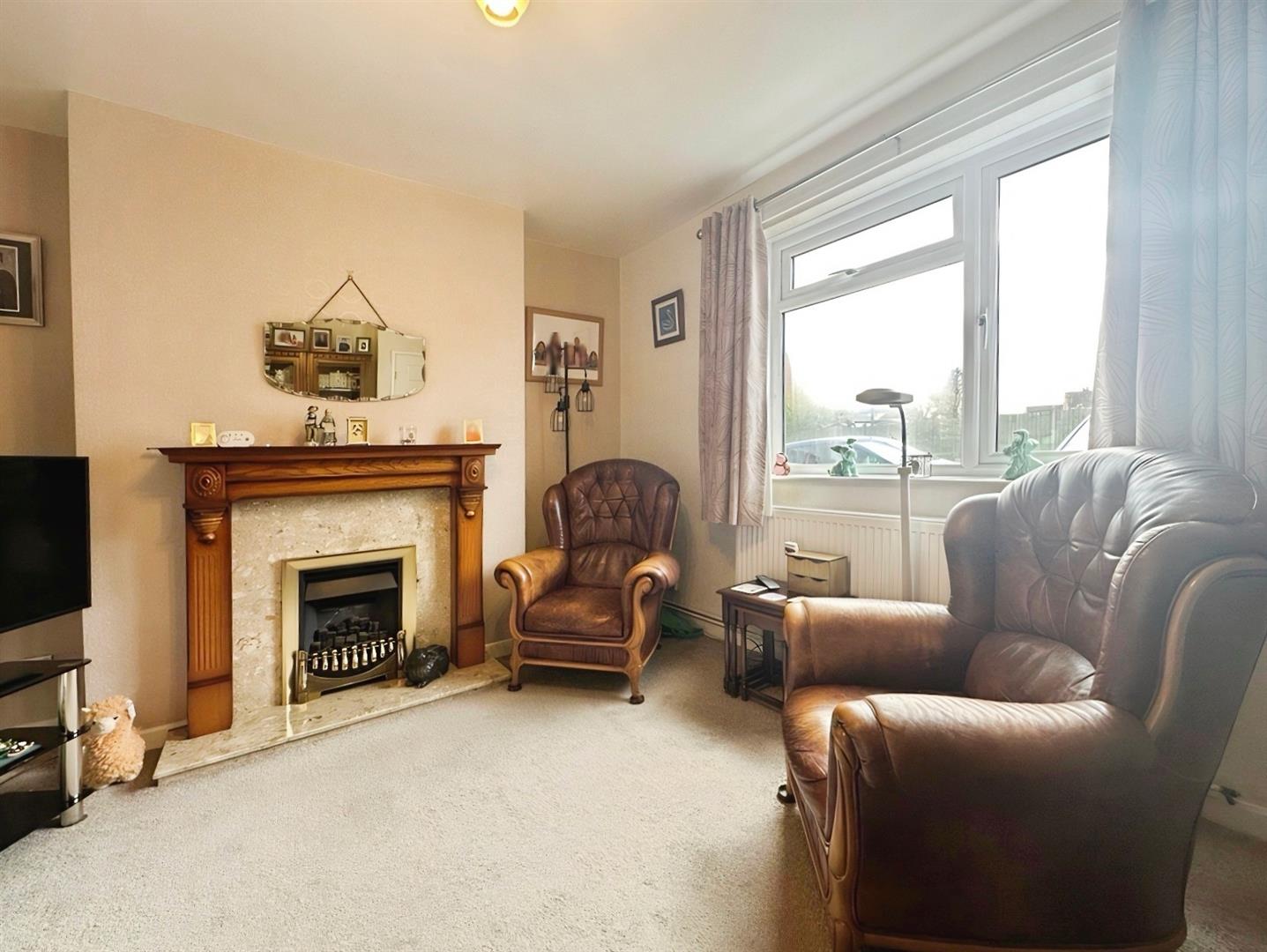 The property is accessed via a welcoming Reception Hallway, with stairs rising to the first floor and a door leading into the spacious Lounge. Positioned to the front elevation, the Lounge offers a comfortable living space featuring carpeted flooring, an inset gas fire with surround, radiator, TV point and central light fitting.
