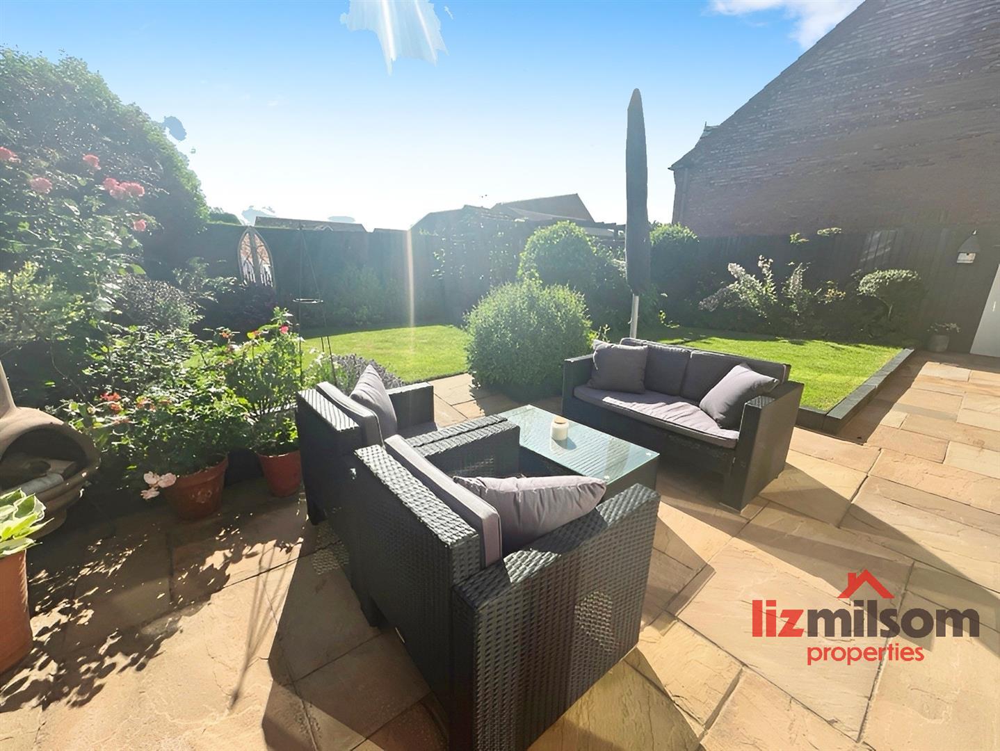 To the front of the property, a block-paved driveway provides ample off-road parking, while a side patio area offers a perfect spot for outdoor dining, especially in the early evenings. This area also allows side access to the beautifully landscaped, south-facing rear garden. The garden is a real highlight, featuring designated spaces for both dining and lounging, an established lawn with flower borders, and a garden shed. Notably, the property is not directly overlooked to the rear, ensuring privacy and a peaceful outdoor retreat.