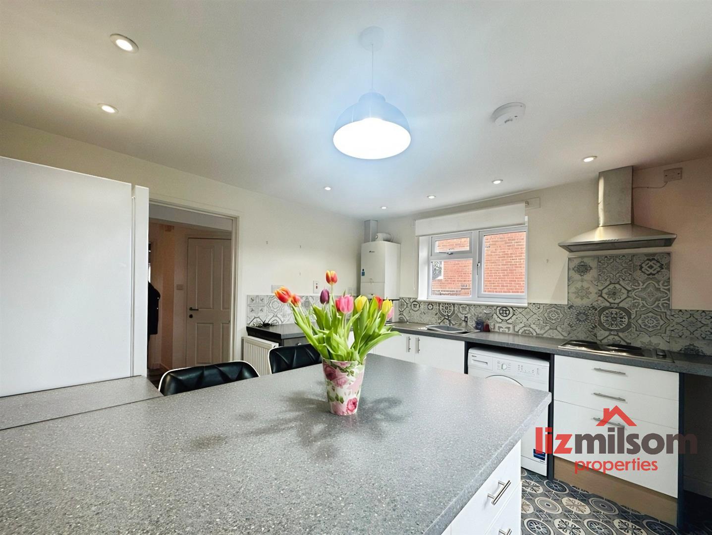 The breakfast kitchen is fitted with a range of wall and floor units, including a breakfast bar, and benefits from integrated appliances including an electric oven, hob, and extractor, with space and plumbing for additional appliances. A side window and rear door with side casements provide plenty of natural light and views over the garden.