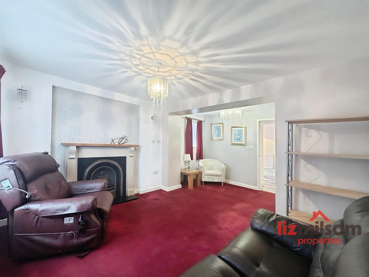 The spacious lounge/diner overlooks the front and side elevations and features carpeted flooring, a TV point, a coal-effect fire with surround, two central light points, and an under-stairs cupboard.