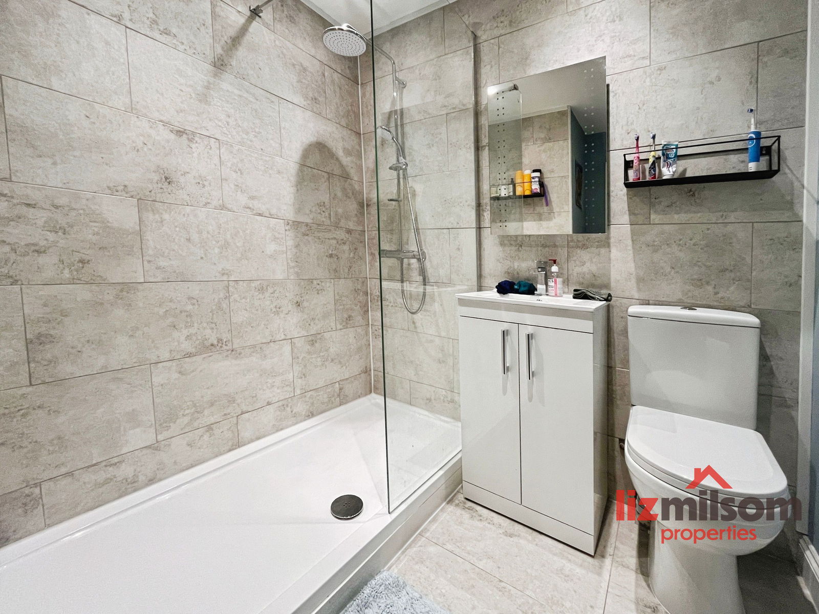 - Contemporary family shower room with double shower cubicle and tiled finish