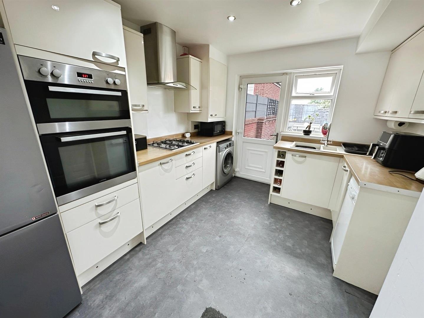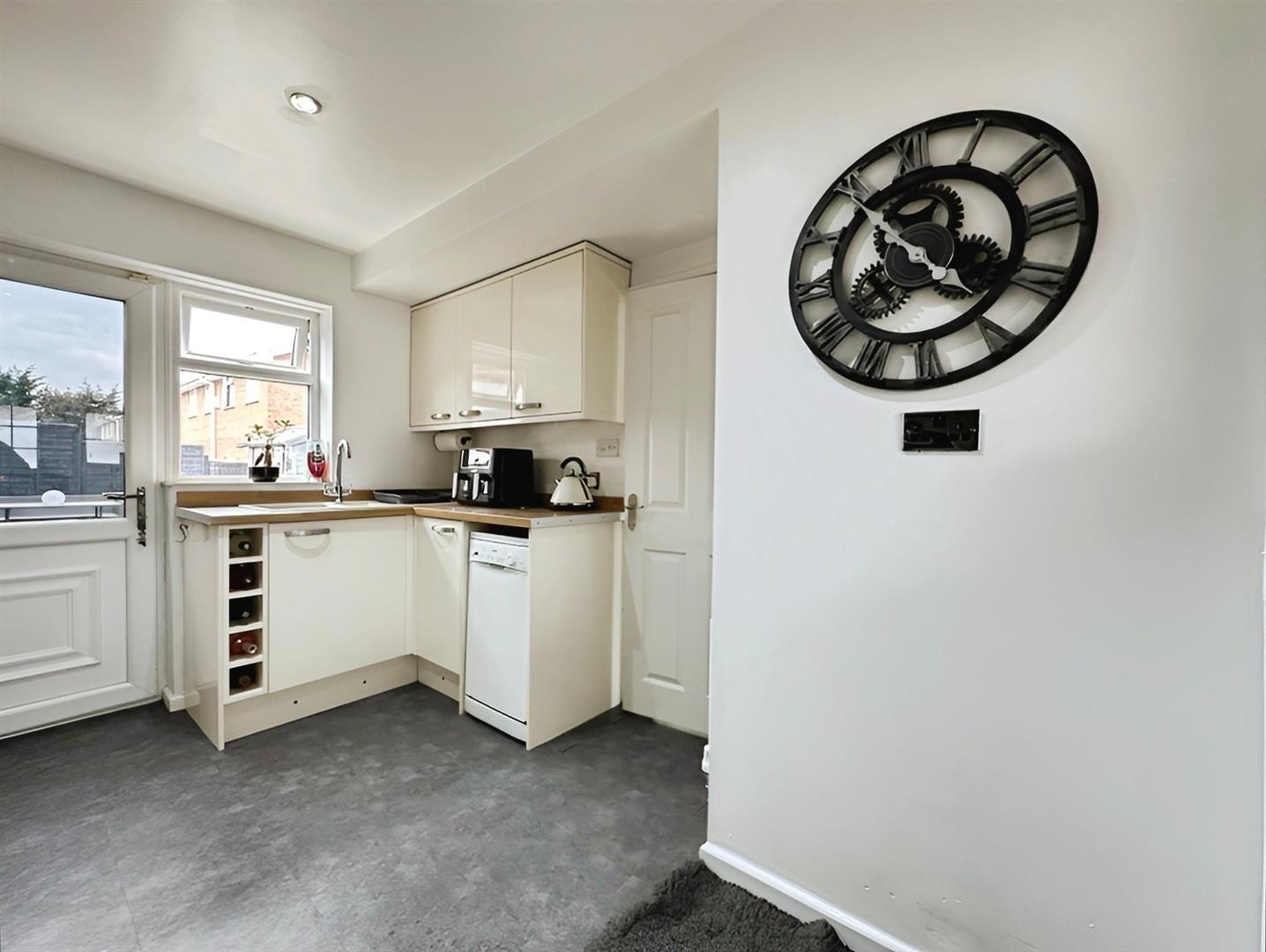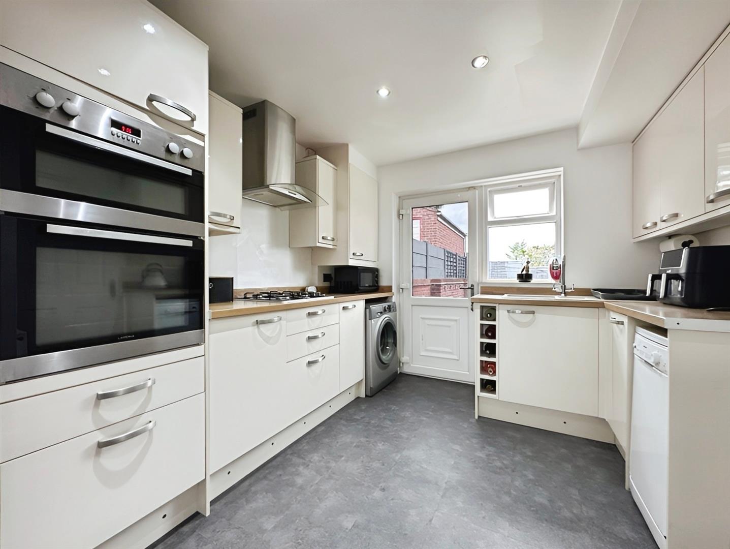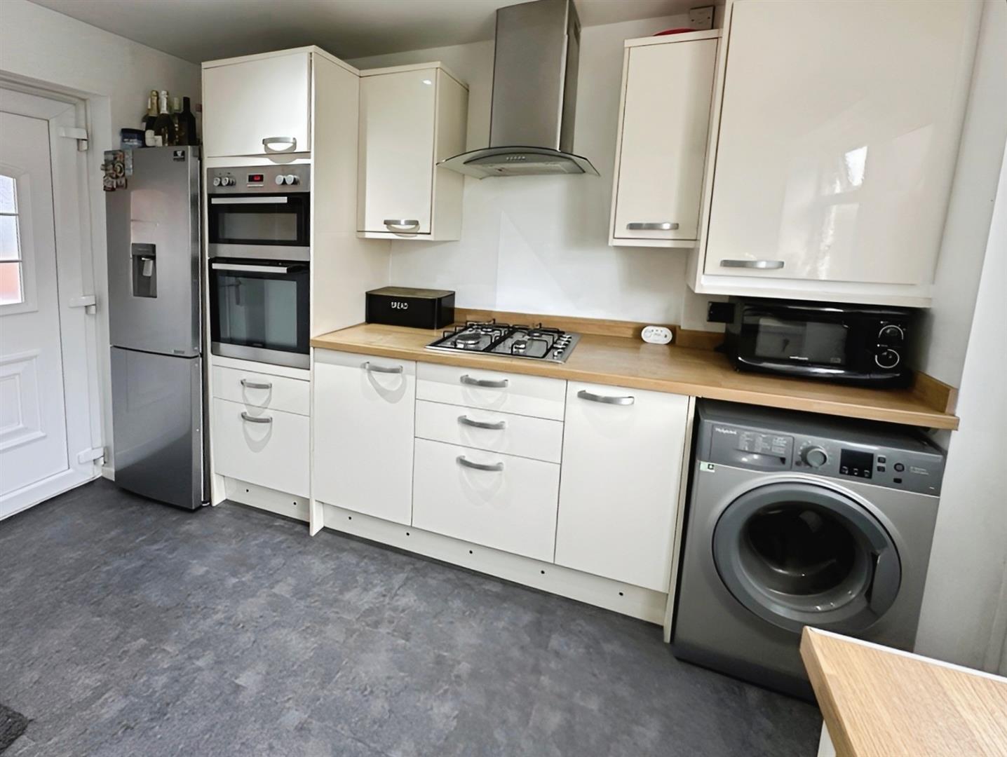 From the Lounge/Diner, a further door leads through to the modern Breakfast Kitchen, which is fitted with a comprehensive range of cream high gloss wall and base units with contrasting stainless steel handles and ample work surface areas. Integrated appliances include an electric oven and grill, gas hob with extractor hood, and there is space and plumbing for free-standing appliances. Additional features include mood lighting inset into the kickboards, a wine rack, and a rear access door to the garden.
