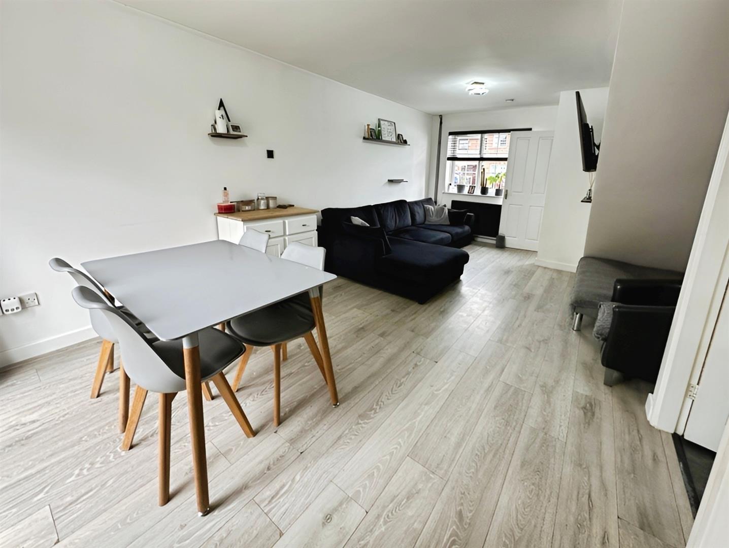 The Lounge/Diner is finished with stylish grey wood-effect flooring, two centre light points, two radiators, and wall-mounted TV points, creating a comfortable and versatile living space.