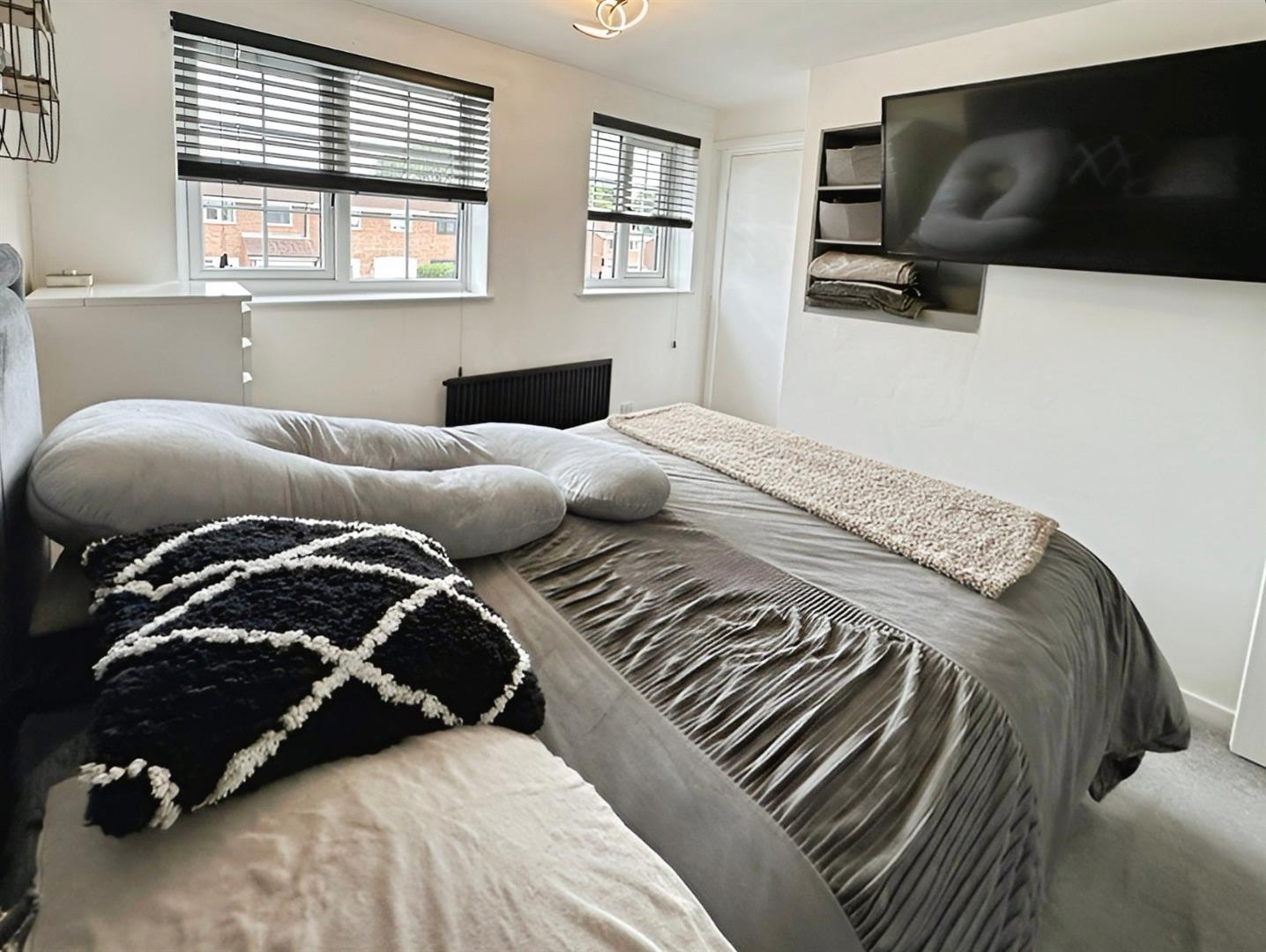 The Principal Bedroom, positioned to the front elevation, is a generously sized double room featuring carpeted flooring, inset wall shelving, a wall-mounted TV point, radiator, and central light point—providing a comfortable and well-appointed space to relax.