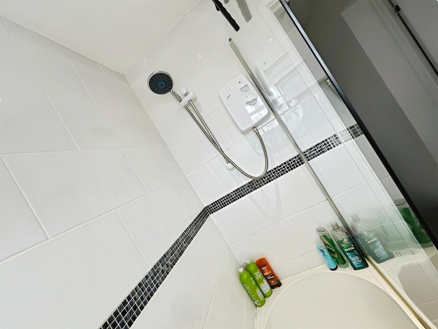 Completing the first-floor layout is the Family Bathroom, fitted with a modern white three-piece suite comprising a panelled bath with mains shower over, low-level WC, and wash hand basin. The space is stylishly finished, providing a clean and contemporary feel.