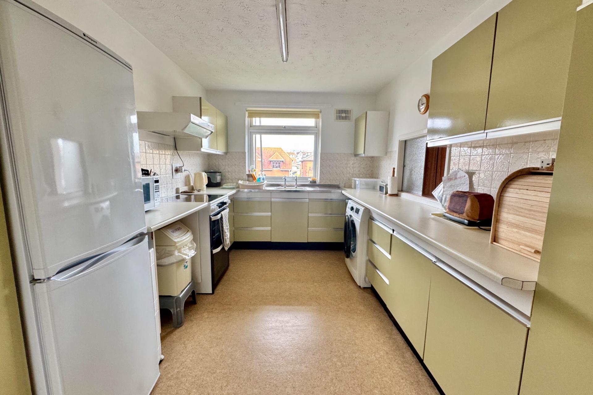 The entrance hall leads through to the generously sized dual aspect living/dining room which spans the full depth of the apartment. Double glazed sliding doors open to the South facing balcony and the dining area has a bay window giving some views of the sea. The kitchen is fitted with a range of units and has space for freestanding cooker, fridge/freezer and washing machine.