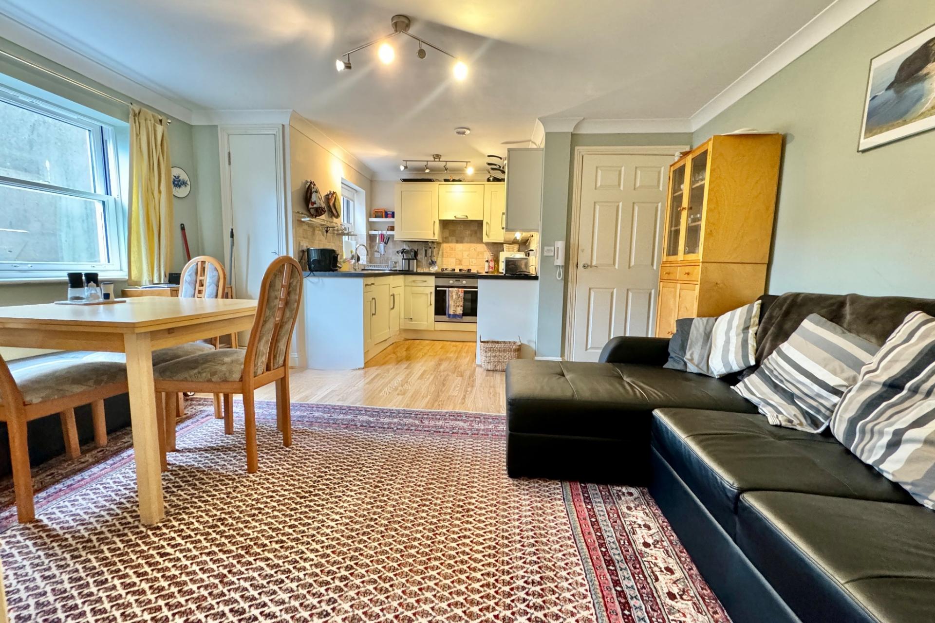 This apartment is ideally situated in the heart of the town, within easy reach of the beach. The entrance hall leads to the neutrally decorated open plan living room/kitchen. The kitchen area is fitted with a range of off-white units, contrasting worktops and integrated oven and gas hob with filtration hood over.