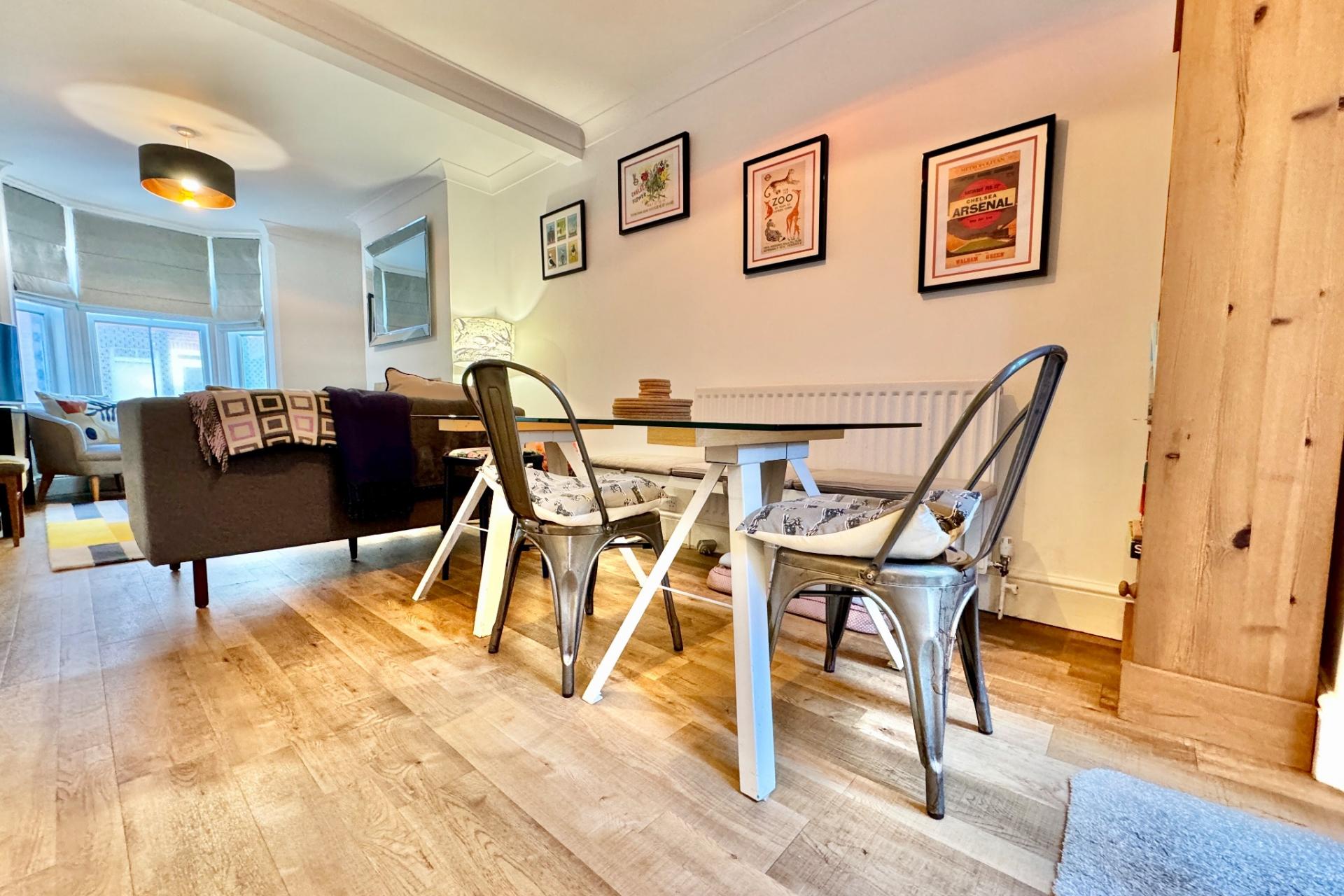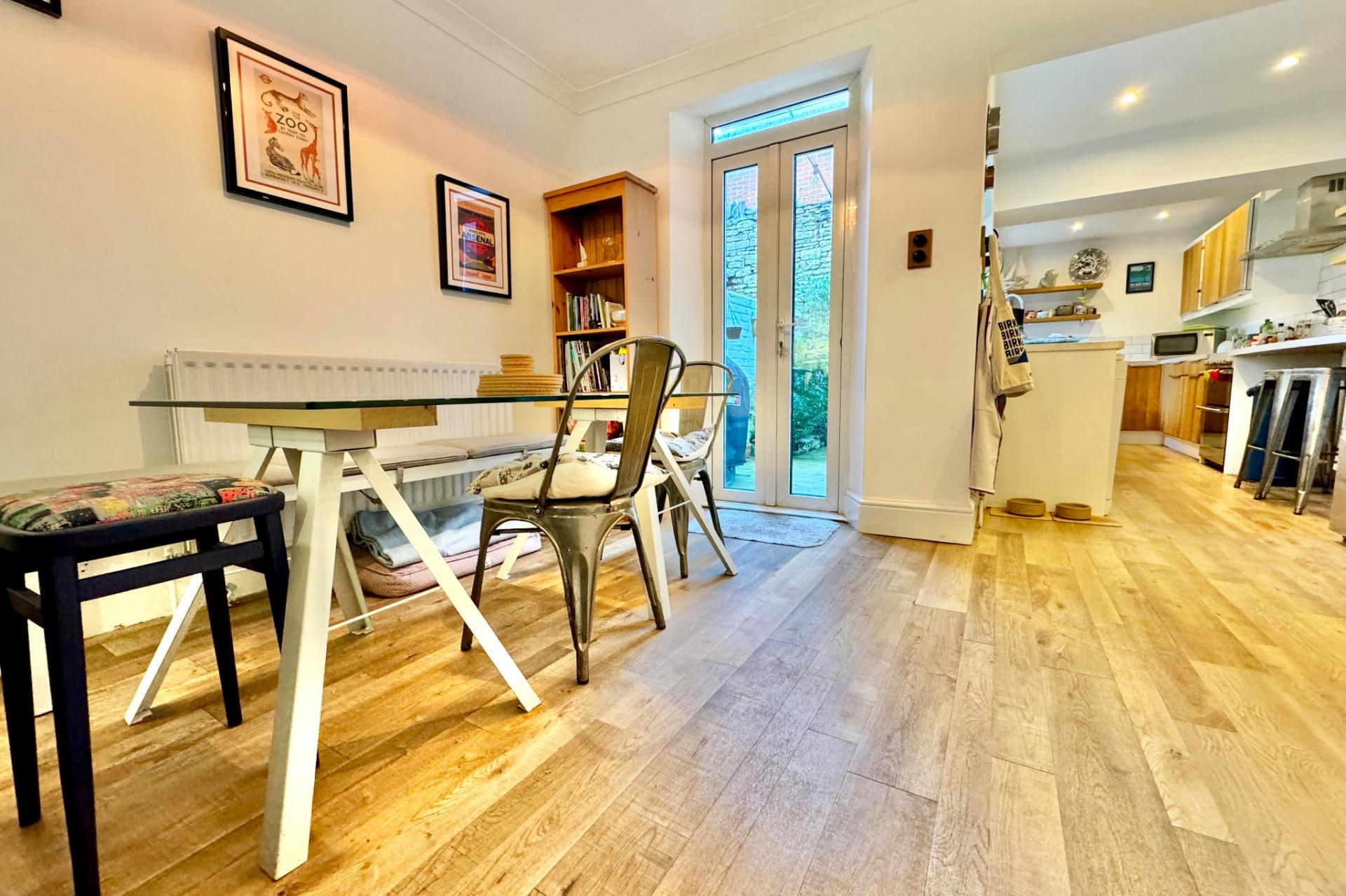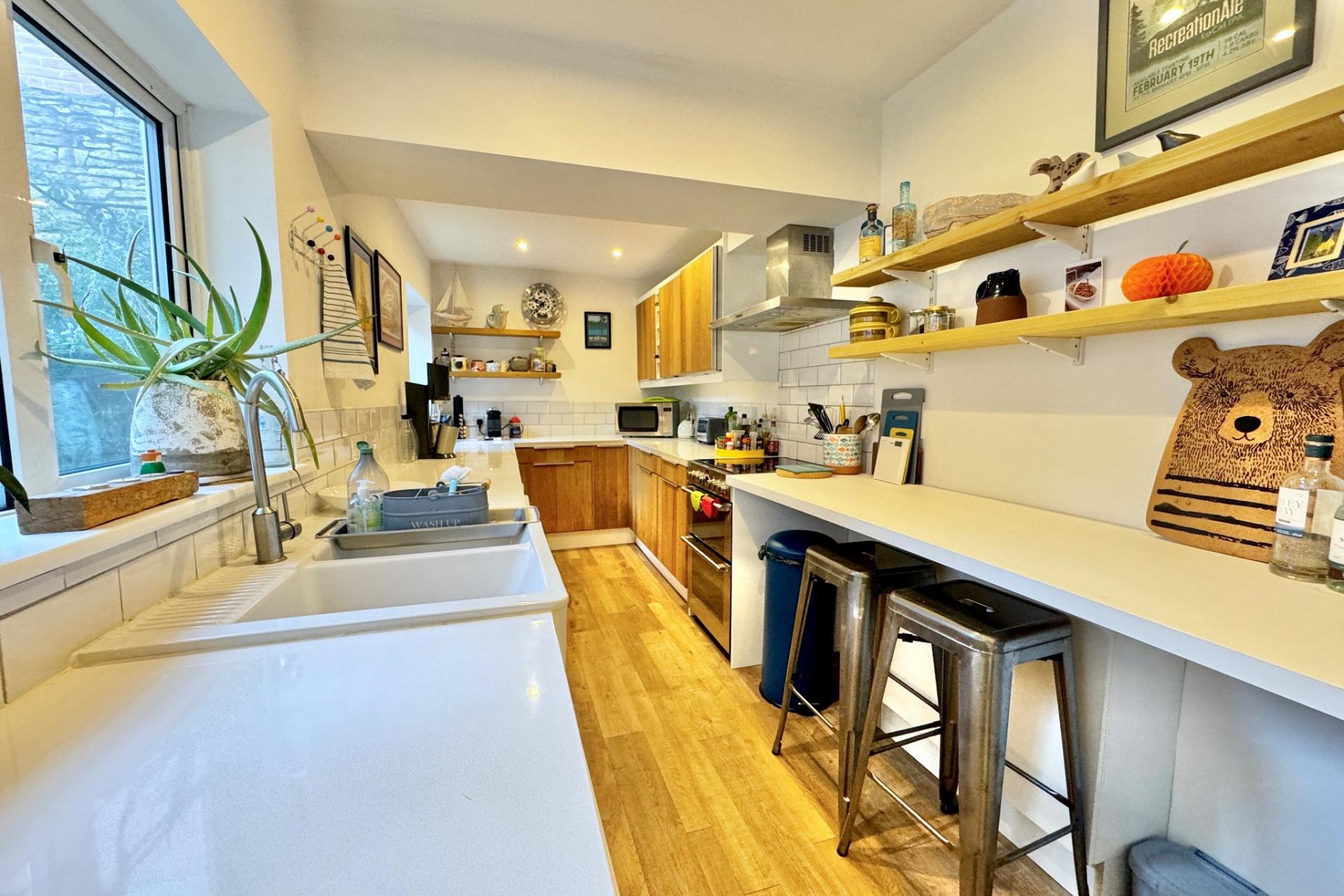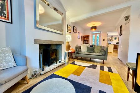 The versatile and spacious accommodation is arranged over 3 floors. The ground floor comprises a large open plan living/dining room with a Purbeck stone fireplace fitted with a woodburning stove, bay window and double doors to the enclosed courtyard garden. The kitchen is fitted with a range of wood units and contrasting light worktops, an electric hob and oven and breakfast bar.