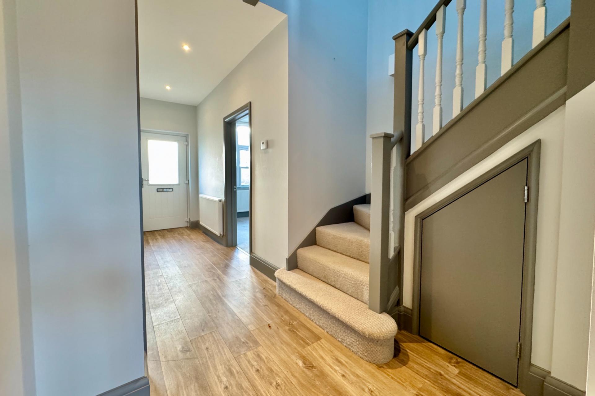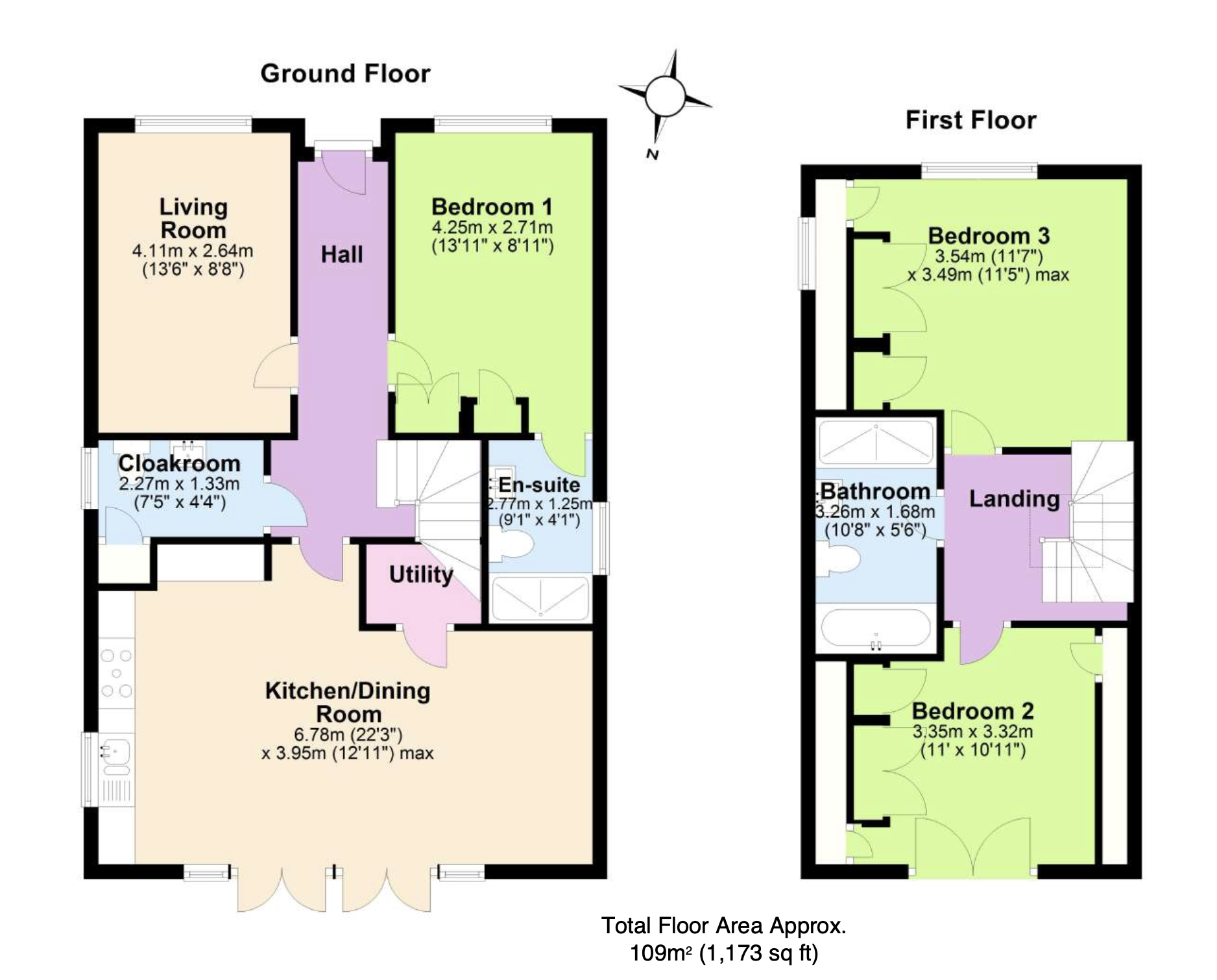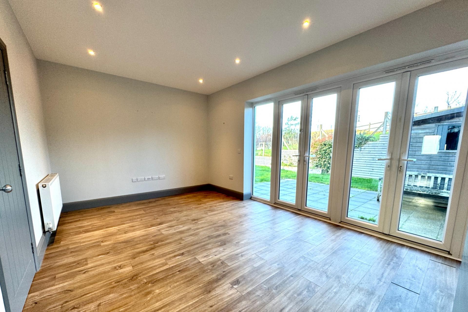 The entrance hall is central to the accommodation and welcomes you to this modern home. Leading off, the living room is South facing and has a large feature window. The open plan kitchen/dining room spans the entire width of the property and is the ideal family hub with large double doors opening to the enclosed large garden, further extending the entertaining space. The kitchen area is fitted with a range of grey units, contrasting worktops, integrated electric induction hob, double oven fridge/freezer and dishwasher. Leading off, the utility has space for a washing machine and tumble dryer. Bedroom one is a South facing double with fitted wardrobes and an en-suite shower room. The cloakroom completes the accommodation on this level.