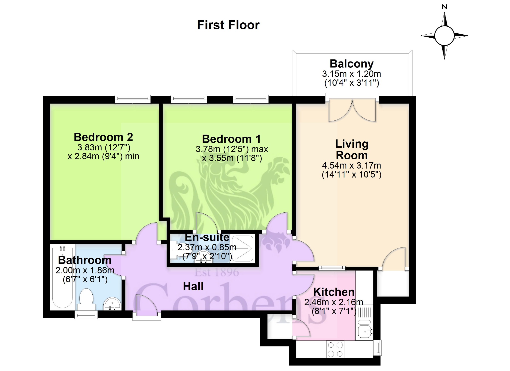 There are two good size double bedrooms; the principal has access to an en-suite shower room with walk-in shower cubicle, wash basin and WC. Bedroom two is dual aspect; bedrooms offer similar views to the living room. The bathroom is fitted with a modern suite in white comprising panelled bath, wall mounted wash hand basin and WC.