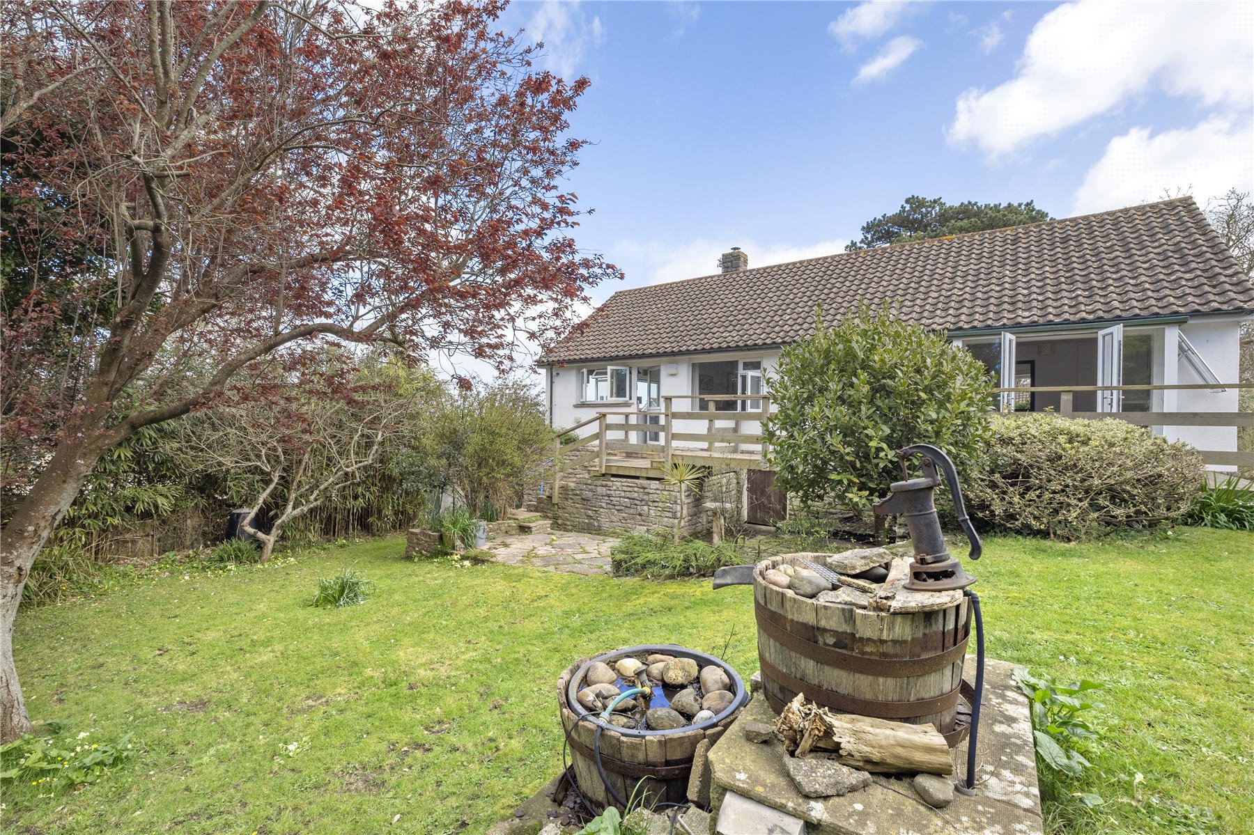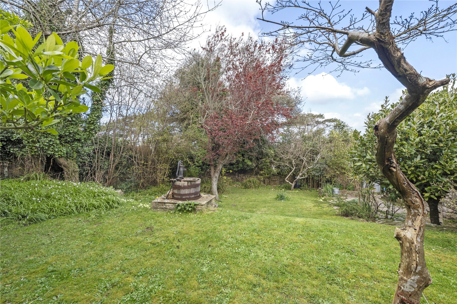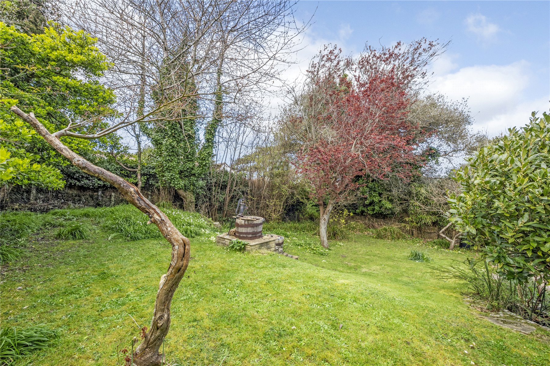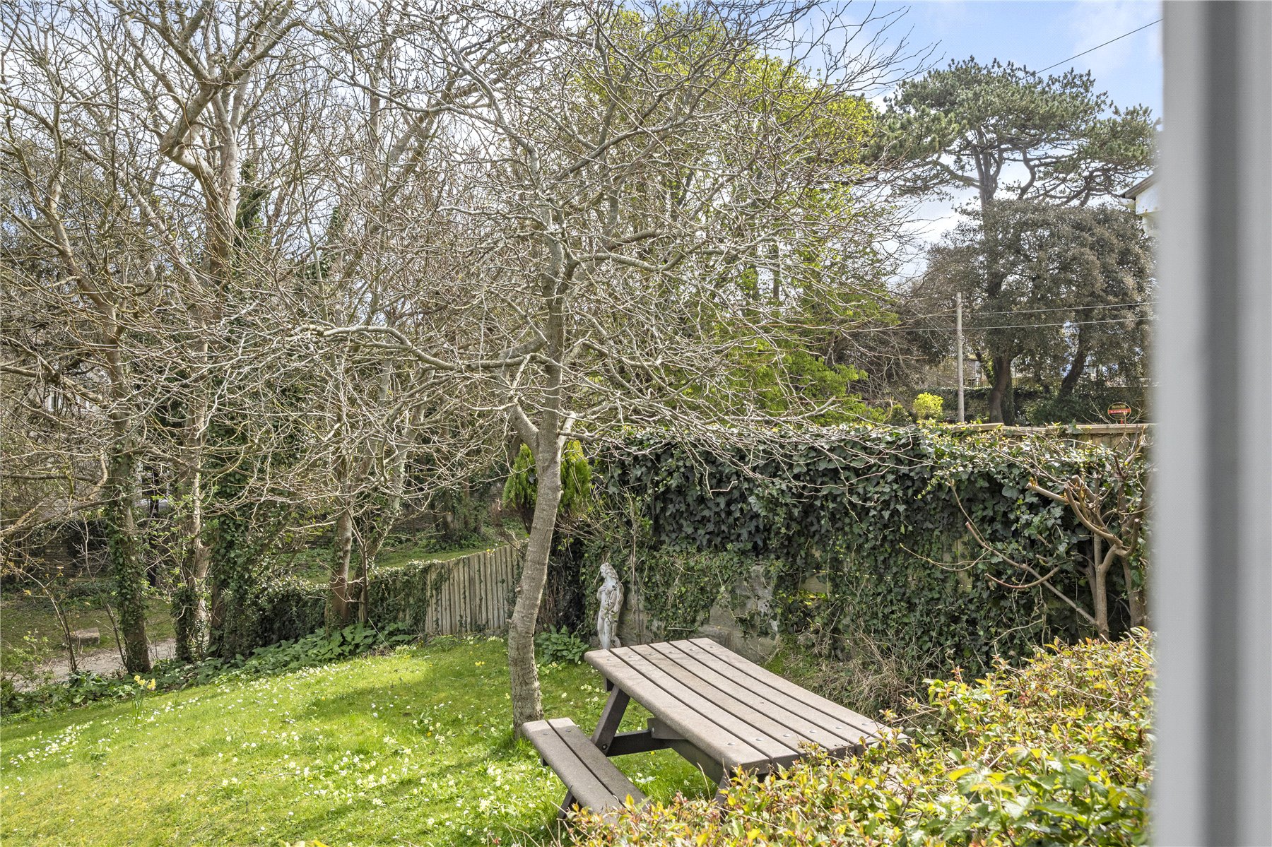 Entering the property through traditional gate posts, there is plentiful parking alongside a lawned area set beneath mature trees, providing privacy while still enjoying open views towards the sea. A slightly elevated seating area offers another spot to take in the coastal outlook.