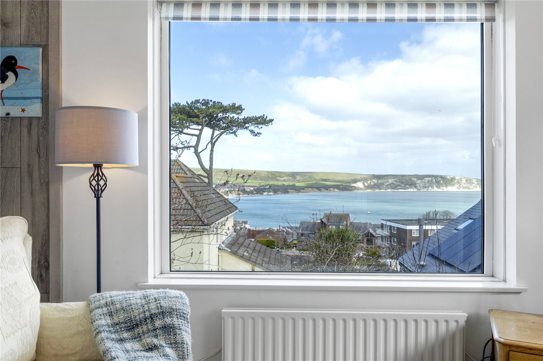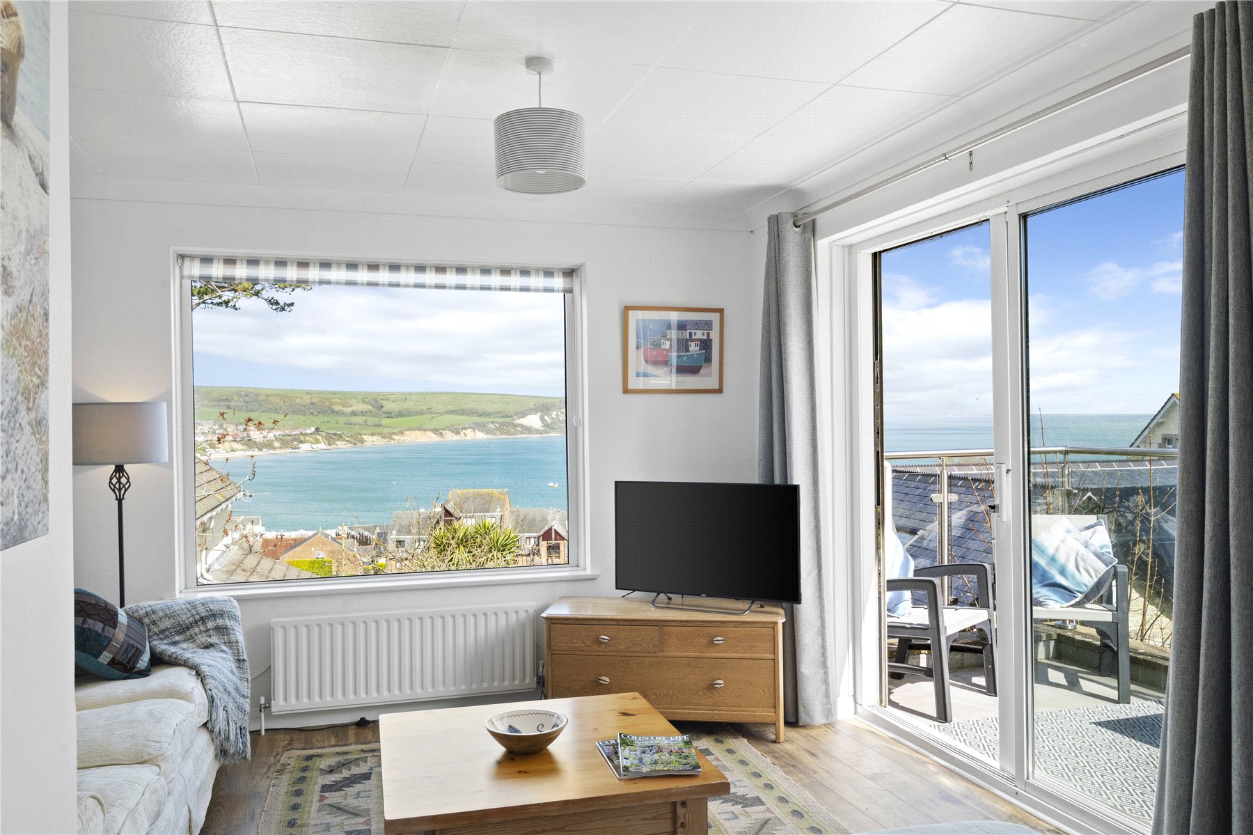 To the right, the property opens into a magnificent SITTING ROOM and KITCHEN / LIVING SPACE. This L shaped room is filled with natural light from three sides and defined by large picture windows framing uninterrupted views across Swanage Bay. Glazed doors open onto a balcony, perfectly positioned to take in the sweeping coastal outlook.