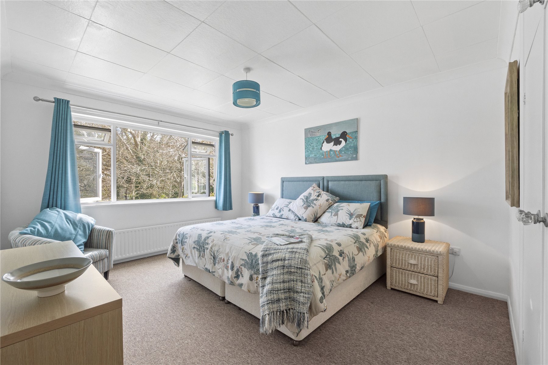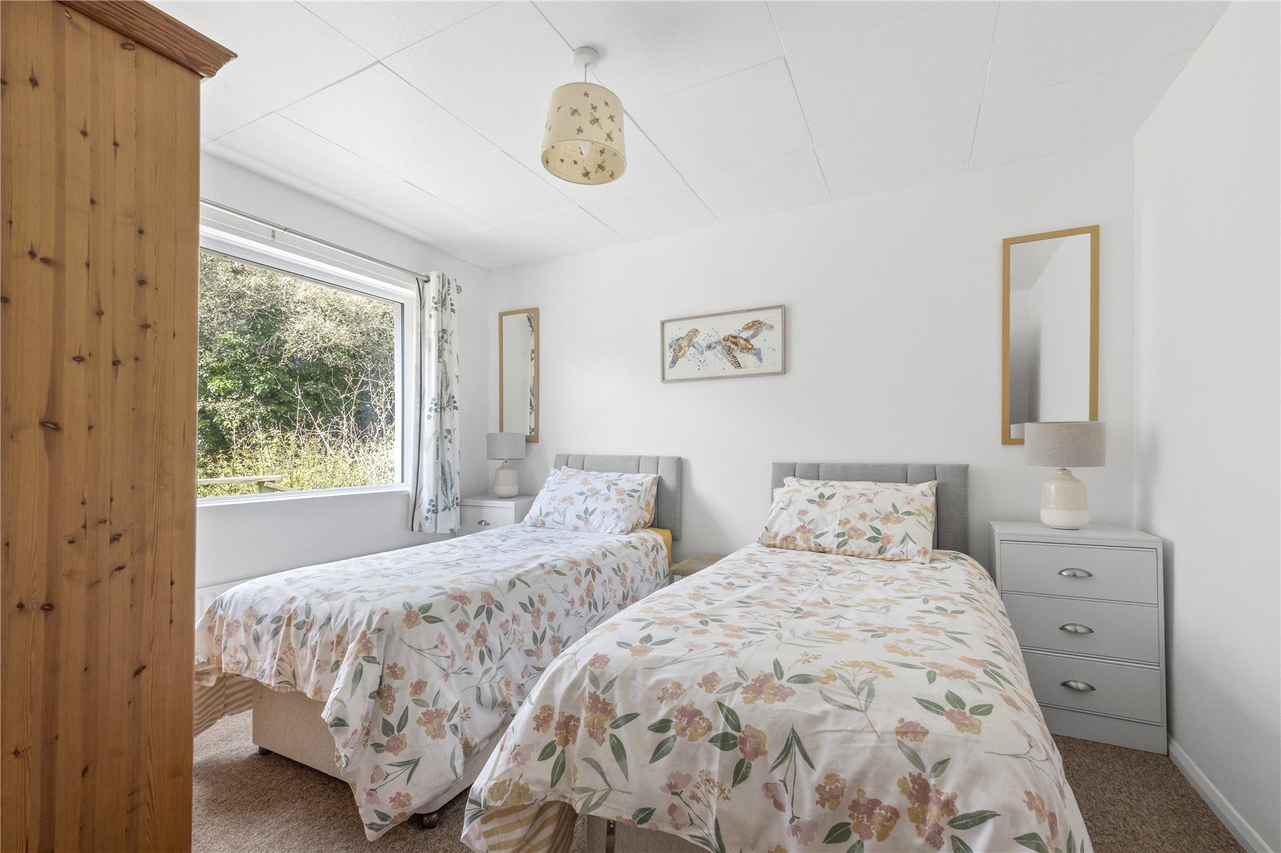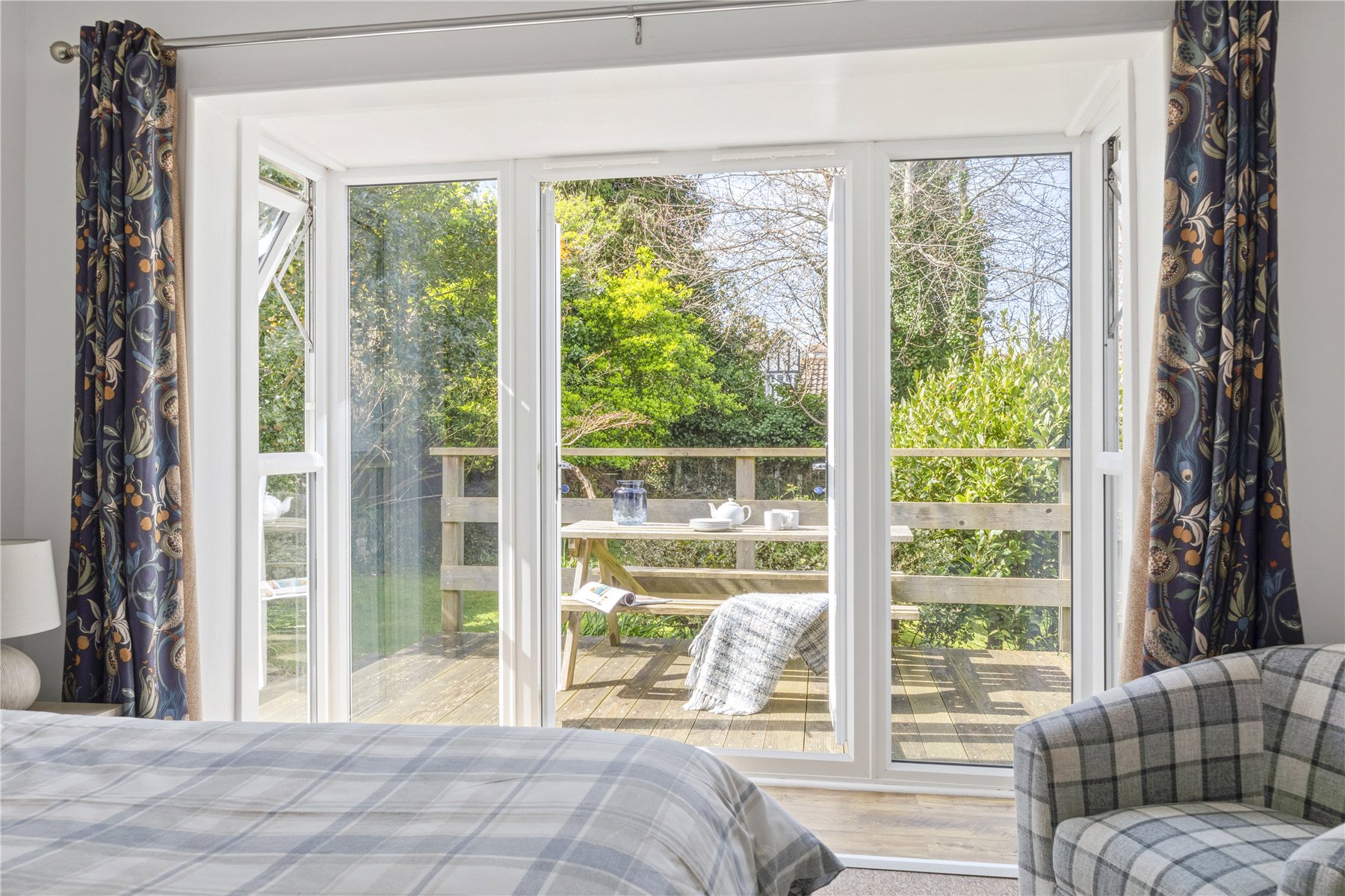 BEDROOM TWO is an elegant double featuring a bay of contemporary windows that open directly onto the elevated deck, with views across the garden. It also benefits from built in wardrobes and generous space for additional furniture. BEDROOM THREE is another well-proportioned double, currently arranged as a twin, with a pleasant outlook across the garden.