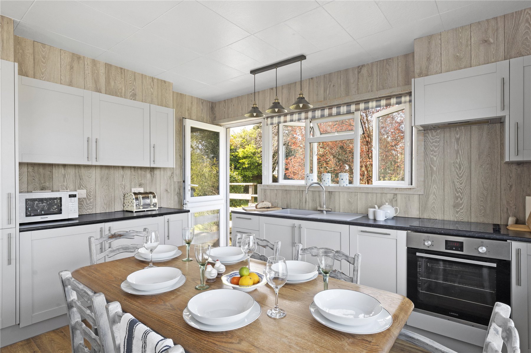 The KITCHEN is fitted with modern appliances and centred around a dining area that comfortably seats six, ideally positioned to make the most of the views across treetops and out to sea. A glazed door to one side leads directly onto the decking, elevated above the secluded mature garden from which Greenhaven takes its name.