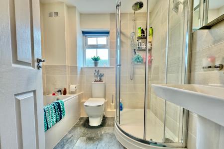 On the first floor, there are two double bedrooms, both benefiting from fitted wardrobes and plenty of storage. The family bathroom is fitted with a modern suite including panelled bath and a large corner shower and completes the accommodation.