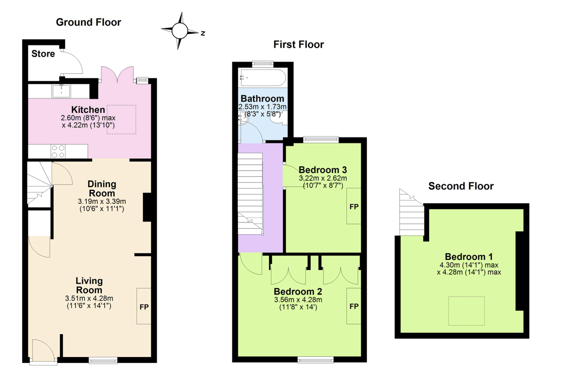 There are two double bedrooms on the first floor, both featuring attractive original fireplaces. Bedroom 2 is East facing and spans the width of the property. Bedroom three is also a good sized double and overlooks the garden at the rear. The bathroom is fitted with a white suite and completes the accommodation on this level.