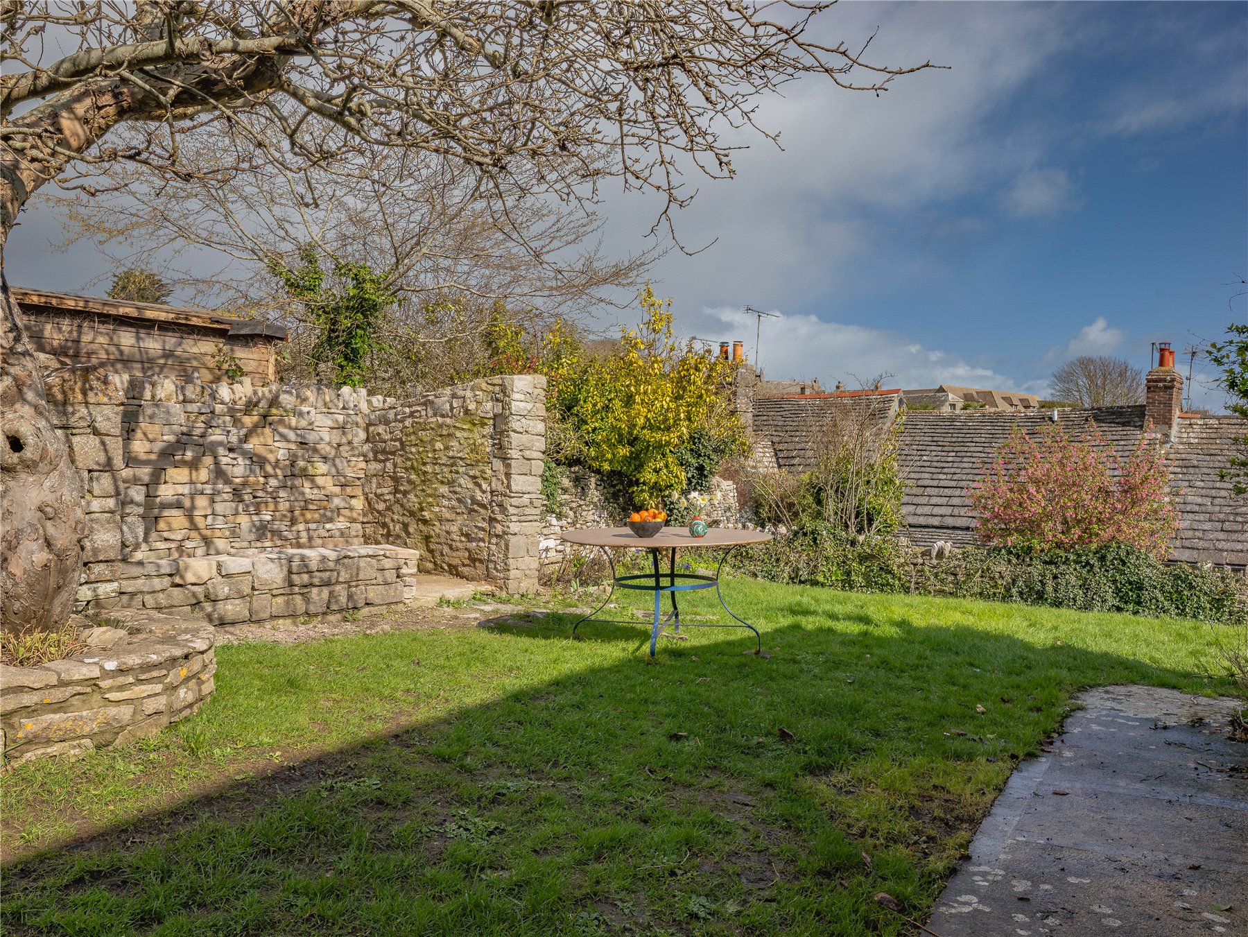 A short walk across the lane leads into the main cottage garden, which wraps around the house. Here, a quintessential Dorset garden unfolds, enclosed by Purbeck stone walls and planted with mature fruit trees, creating a series of quiet corners to sit and enjoy the setting.