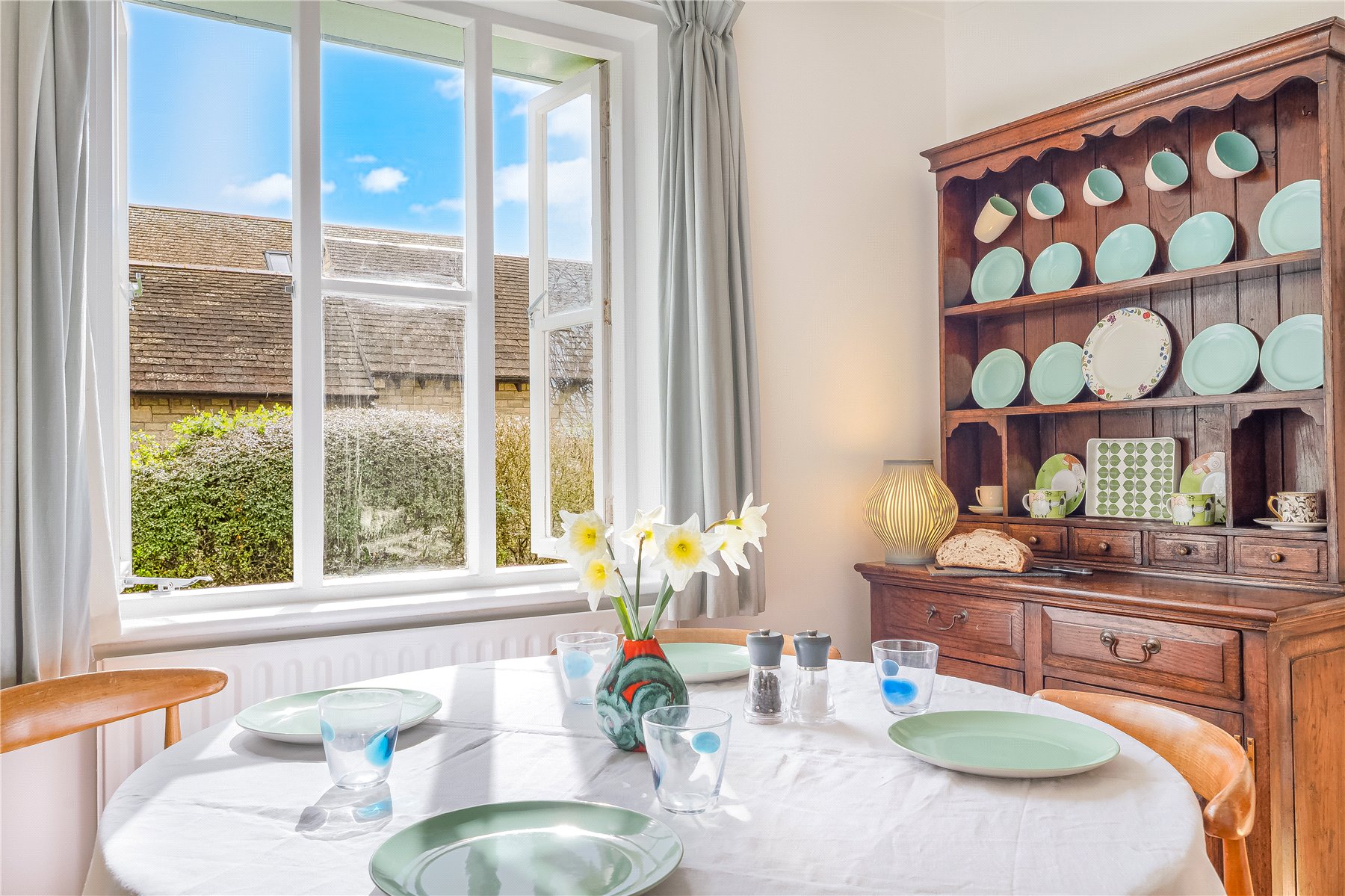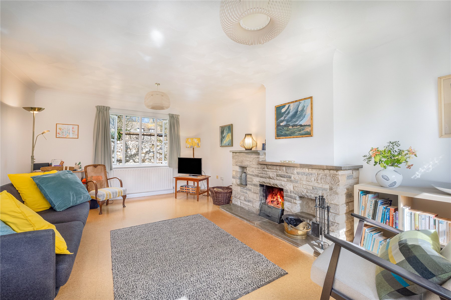 What is immediately apparent on entering is the exceptional sense of light and openness, enhanced by its position within a wraparound garden. A bright HALLWAY welcomes you in, with space for coats and boots, and from here all rooms lead off. The SITTING ROOM enjoys a dual aspect, with large windows overlooking both the front and rear gardens, allowing natural light to pour in throughout the day. A table and chairs are positioned to make the most of the sunny outlook, while a Purbeck stone fireplace provides a cosy focal point in the evening.