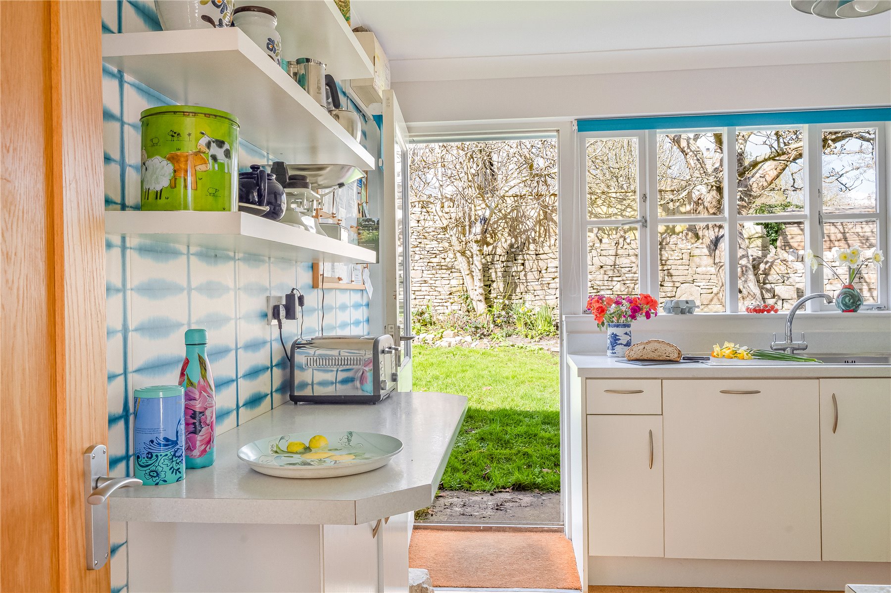 Adjacent to this is the KITCHEN, well-proportioned and fitted in a mid-century style, opening directly onto the garden and offering excellent scope for modernisation or reconfiguration.