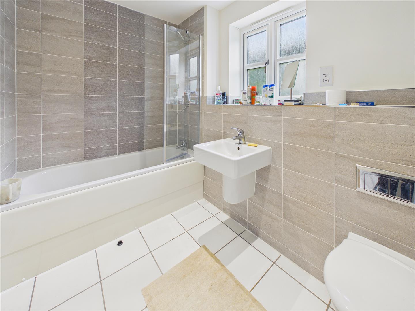 Bathroom - Comfortably sized, half tiled family bathroom comprising bath with shower screen and fitting, low flush W.C. and wash-hand basin beneath window to the rear elevation.