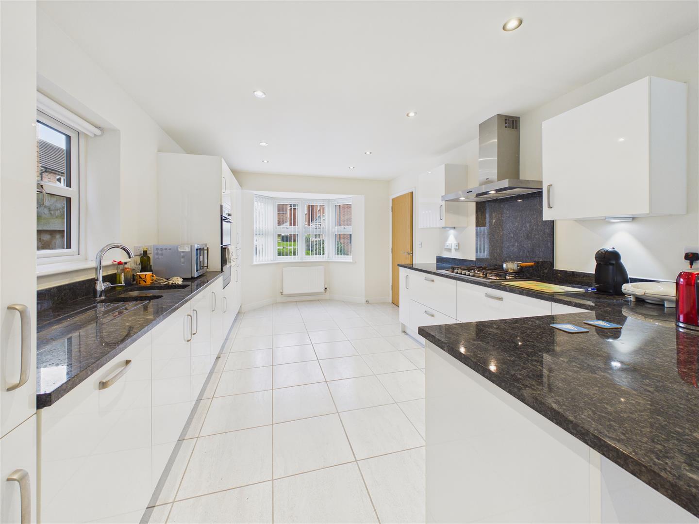 Kitchen/Dining Room - Through room comprising a kitchen and dining area. The kitchen is of a contemporary finish with fitted units and granite worksurfaces throughout, incorporating an inset sink with mixer tap and benefitting from an array of integrated appliances including a double oven, five ring gas hob with filter above, fridge/freezer and dishwasher.. Bi-folding doors lead out to the rear garden.