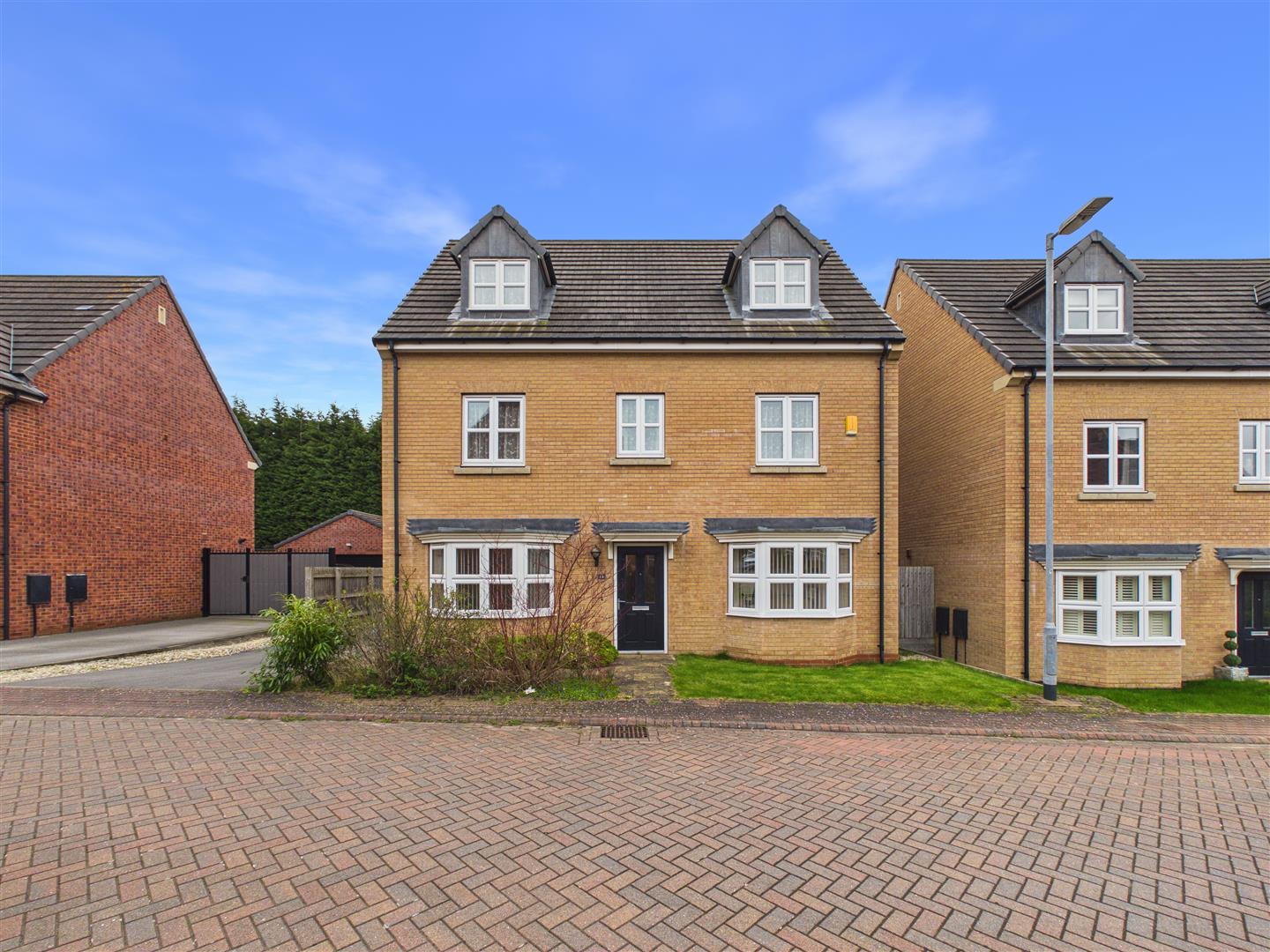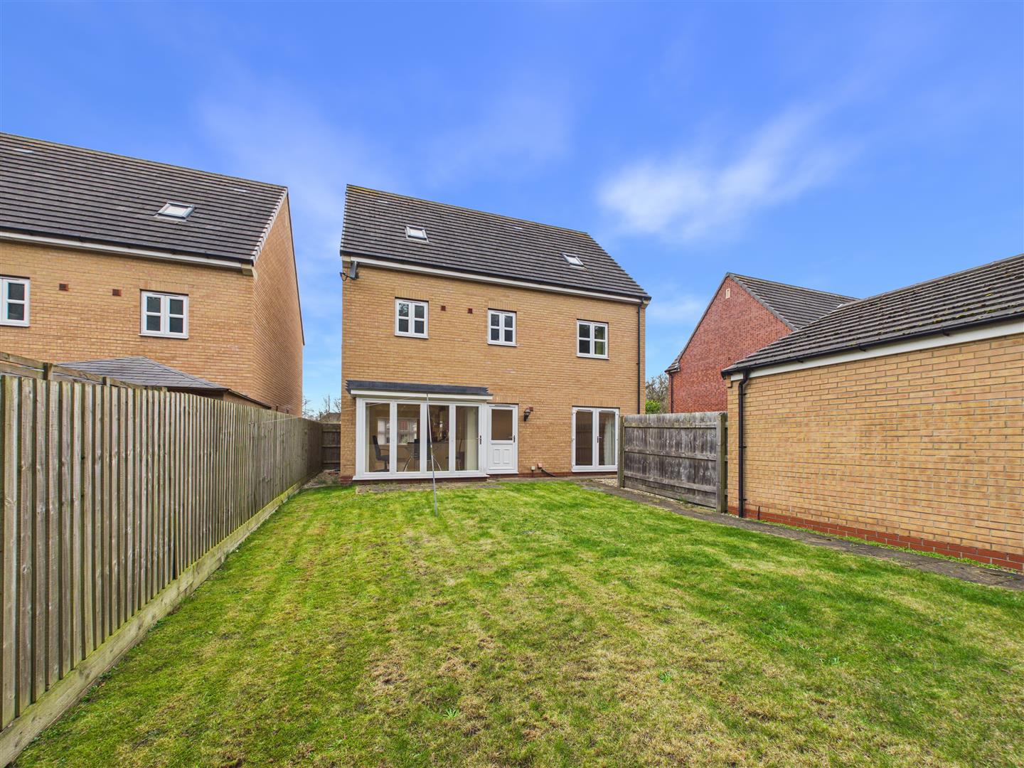 Detached townhouse with no onward chain. Features a large dining/living kitchen with bi-folds, separate lounge, and study. Five double bedrooms across two floors, including a main suite with dressing area. Private rear garden, side drive, and detached double garage.