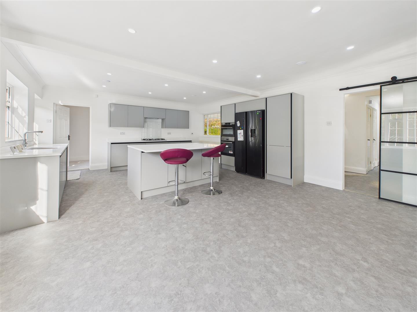 Living Kitchen - Having been remodelled to create a superb modern design, this particularly spacious room is light and airy with windows to the west allowing light to flood in. The kitchen has an extensive range of recently installed contemporary units with quartz work surfaces. There is an integrated AEG oven and grill/second oven, five ring gas hob, extractor hood above, undercounter sink with mixer tap, dishwasher, central island with breakfast bar peninsular, housing for an American style fridge freezer.