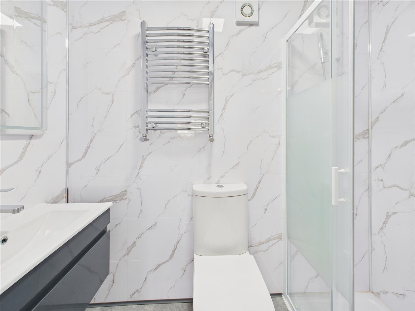 En-Suite Shower Room - With suite comprising low level W.C., wash hand basin in cabinet, shower enclosure with handheld and rainhead shower system, heated towel rail.