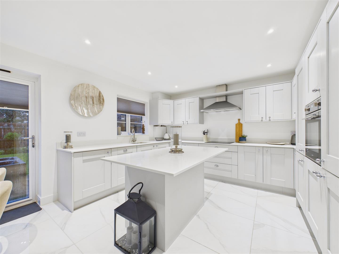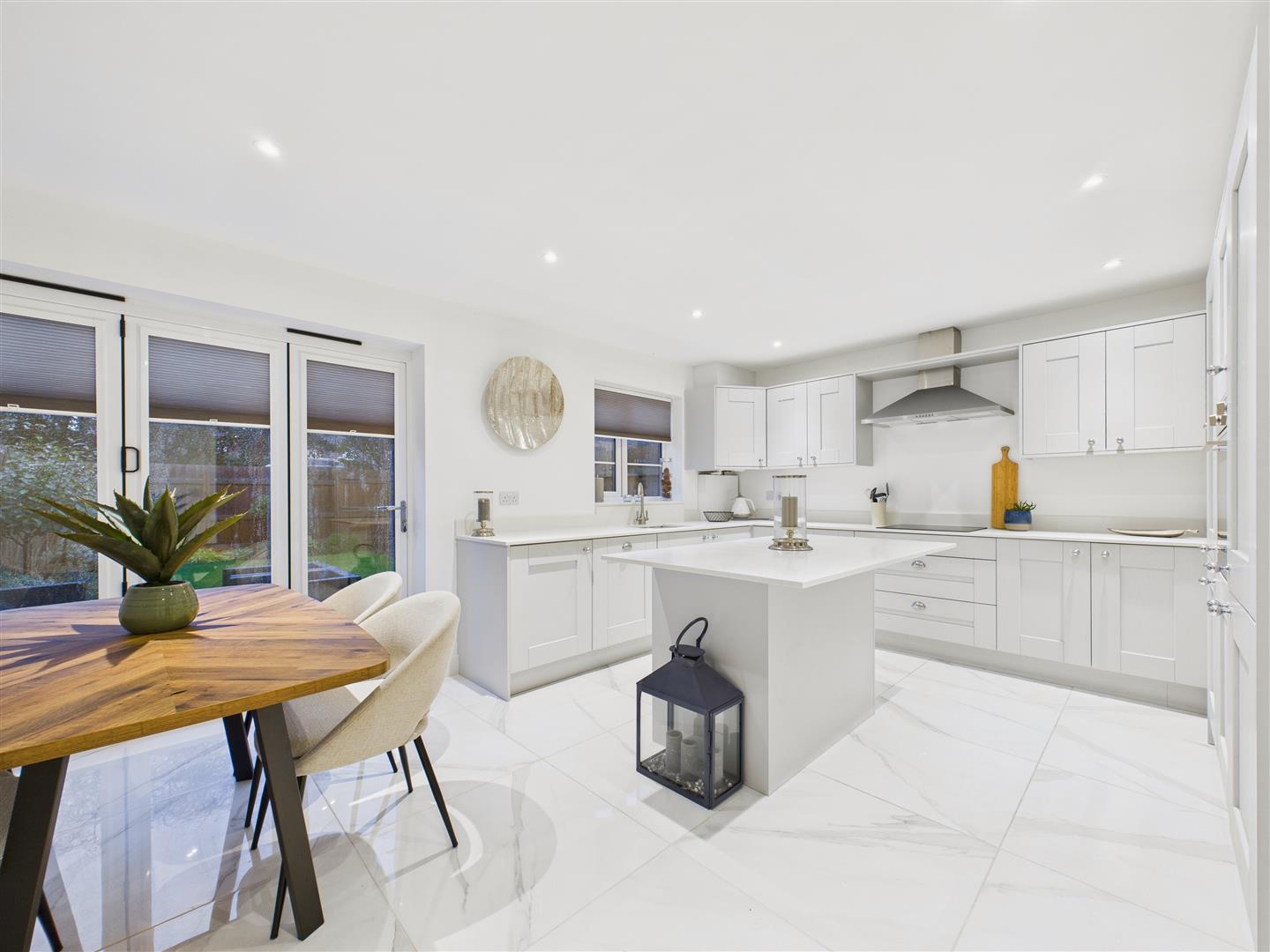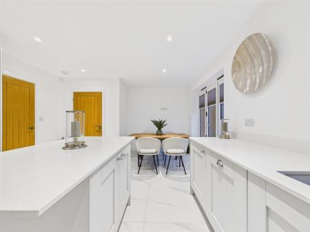 Kitchen/Diner - Contemporary kitchen/diner with an island centrepiece, featuring fitted shaker-style units, quartz worksurfaces and a range of integrated appliances including dishwasher, fridge-freezer and oven. A one-and-a-half sink & drainer sits beneath a window to rear and there is a four-ring induction hob with filter unit above. Adjacent to the kitchen is a dining area, with a set of bi-fold doors opening out to the rear patio.