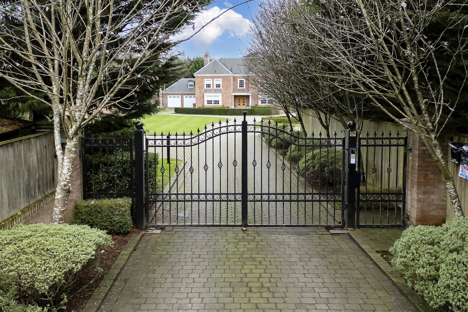 Outside - This exclusive gated development comprises only three fine individual detached houses and is accessed via its own private lane with gates opening to a sweeping driveway adjacent to which is a open green space adding to the attraction of the setting. The property itself has a private driveway and lawn bounded by box hedging. The driveway provides parking in front of the house and to the side drive with attached double garage beyond. The property occupies an overall plot of approximately half an acre. An extensive patio area lies directly to the rear of the house with lawn beyond. There is also space to one side of the house ideal for log store/sheds etc..
