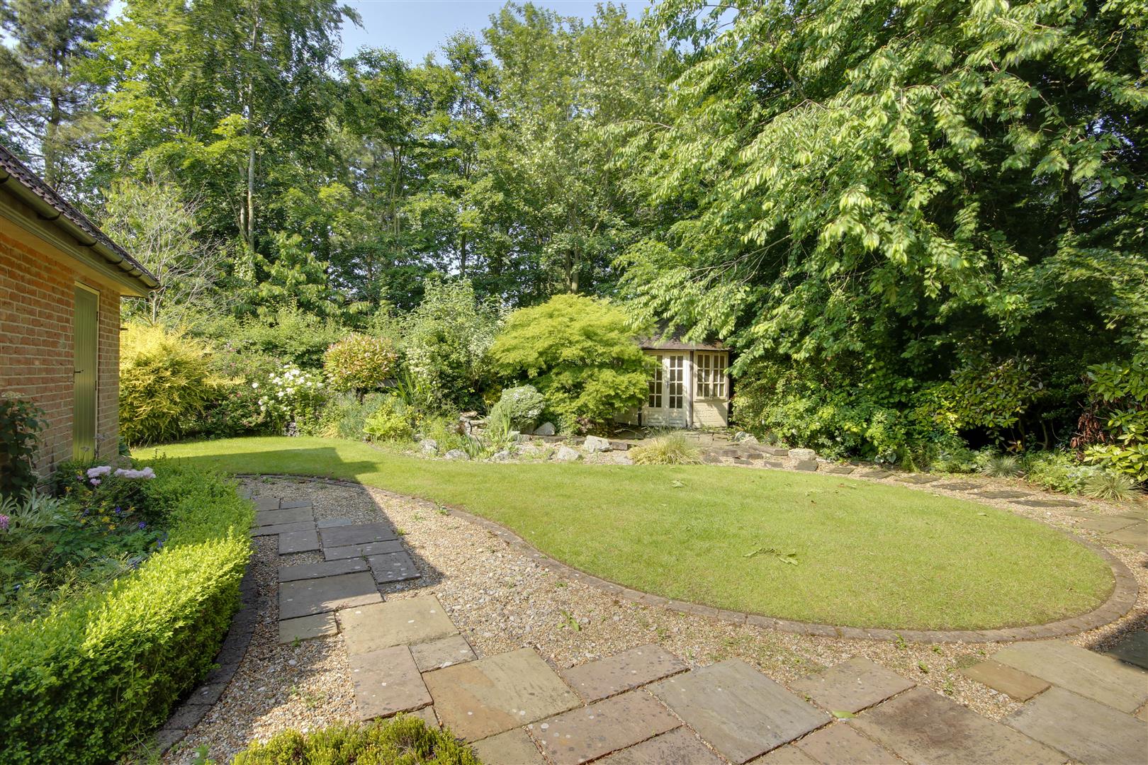 Outside - To the front of the property is a lawned garden and a double width driveway leading onwards to the detached double garage. The rear garden offers much privacy and enjoys open woodland/fields to the rear. There is a circular lawn, patio, pond and rockery plus a summerhouse.