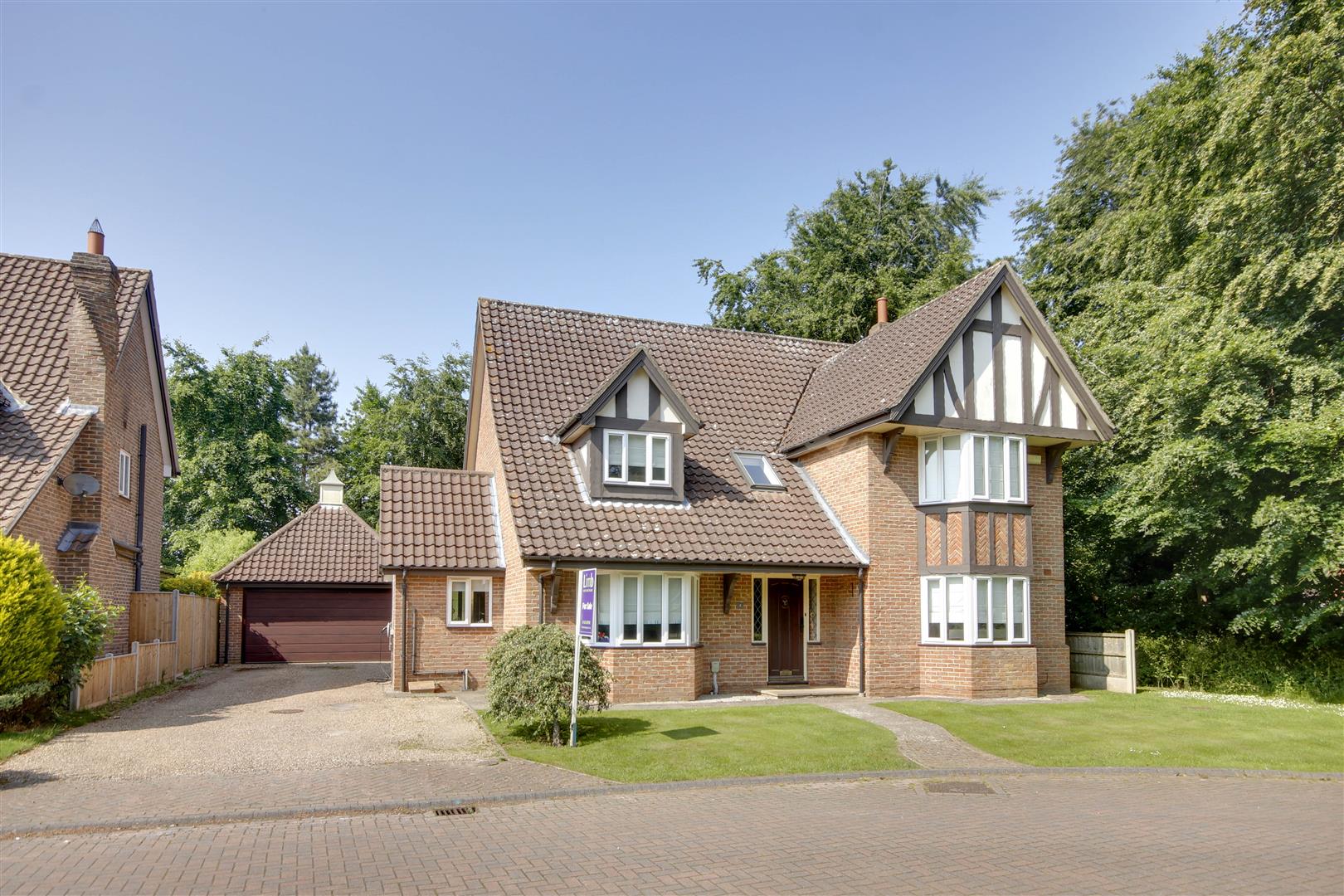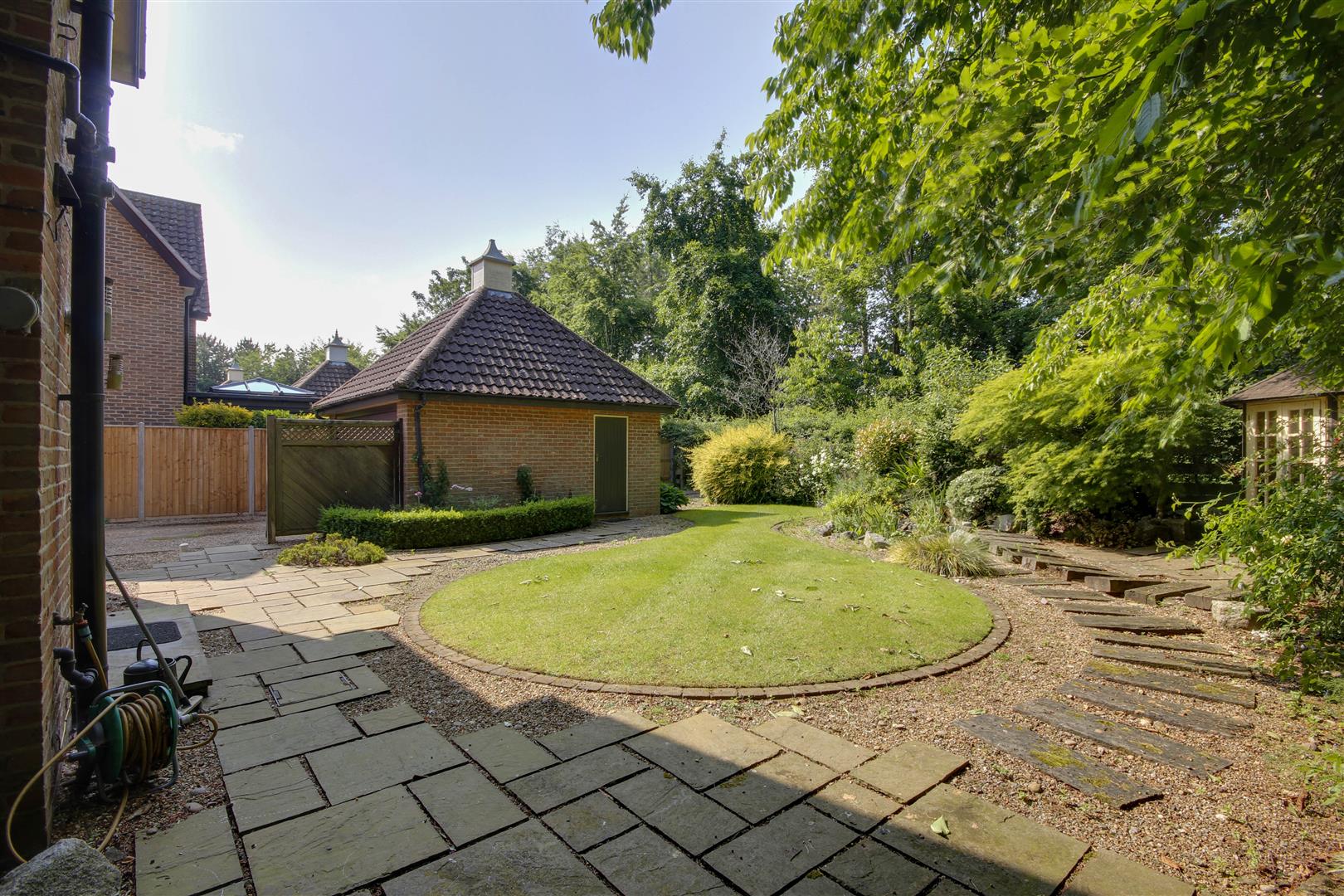 To the front of the property is a lawned garden and a double width driveway leading onwards to the detached double garage. The rear garden offers much privacy and enjoys open woodland/fields to the rear. There is a circular lawn, patio, pond and rockery.