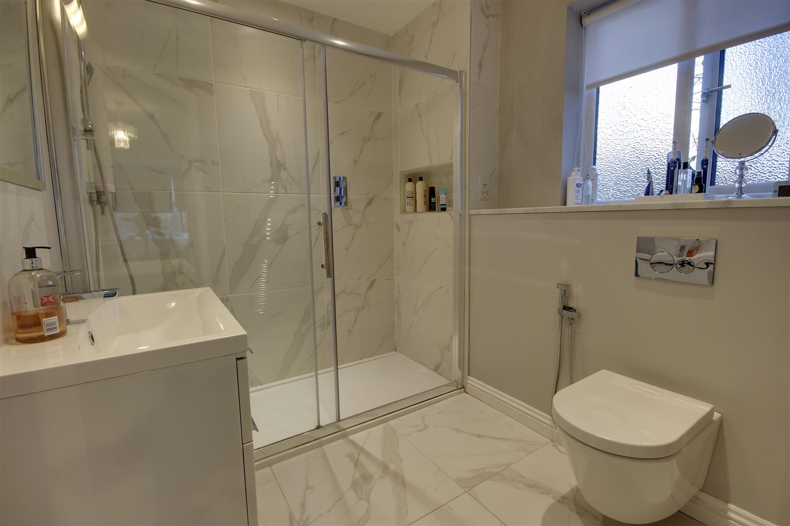 En-Suite Shower Room - With modern suite comprising a large walk in shower, vanity unit with wash hand basin, low flush W.C., heated towel rail, inset spot lights, tiled floor and window to side.