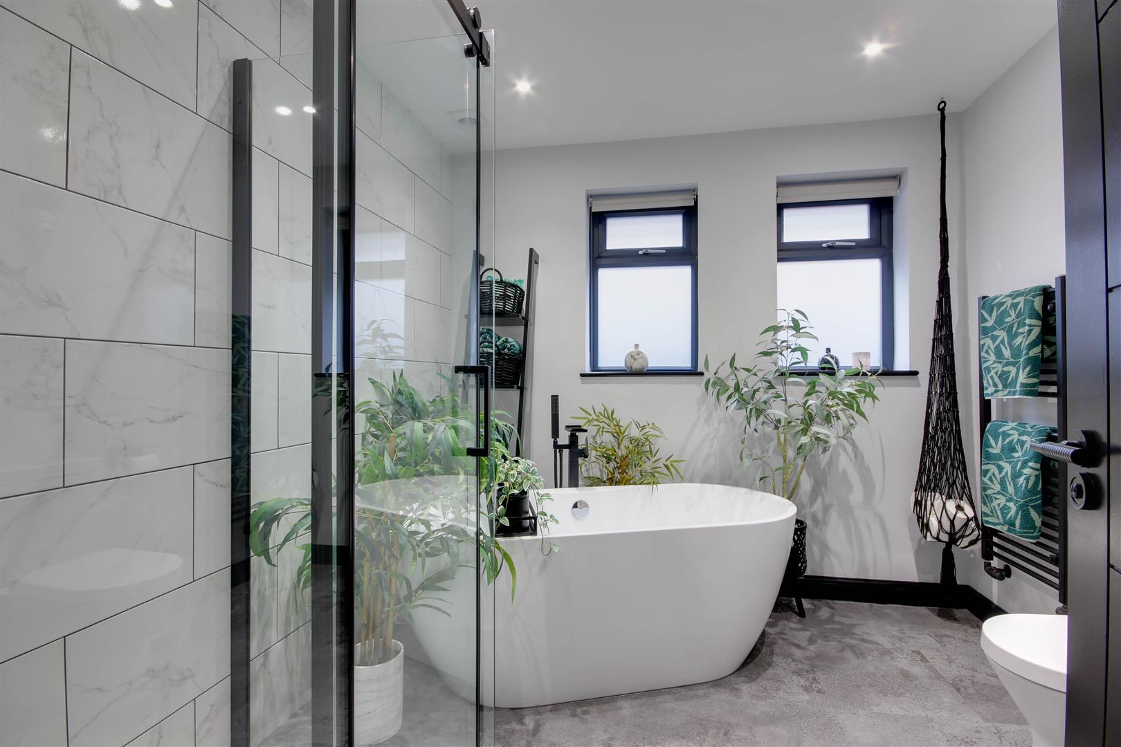 Bathroom - With luxurious suite comprising a deep bath with floor standing tap with shower attachment, shower enclosure with rainhead shower, wash hand basin and low flush W.C. Heated towel rail, tiling to walls, inset spot lights and windows to side elevation.