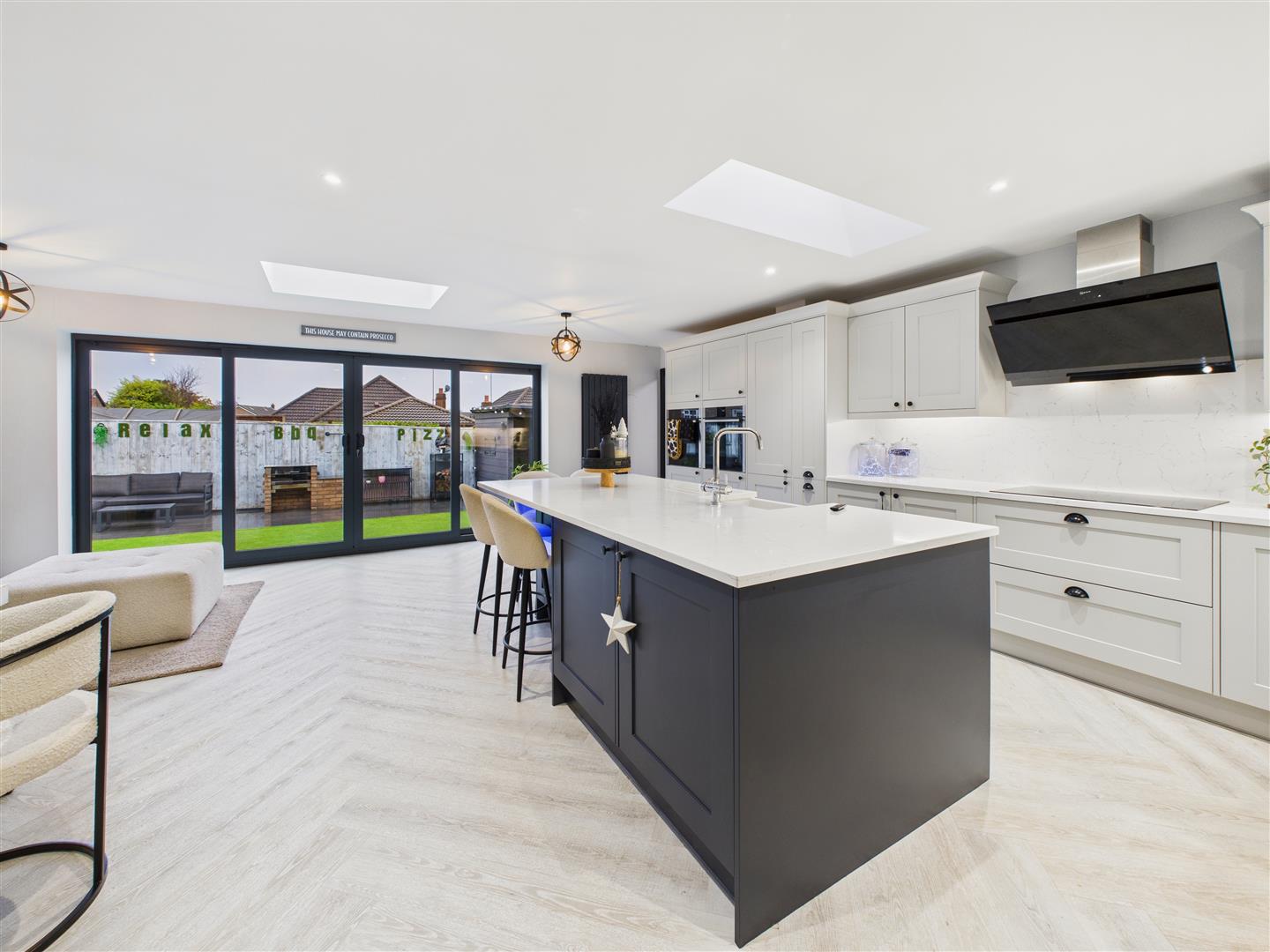 Kitchen Area - Having a range of contemporary dual tone base and wall units with granite worktops and large central island with breakfast bar peninsular. There is a belfast sink with boiling water tap, two Neff "hid and slide" ovens, induction hob with filter hood above, two fridge/freezers and a dishwasher.