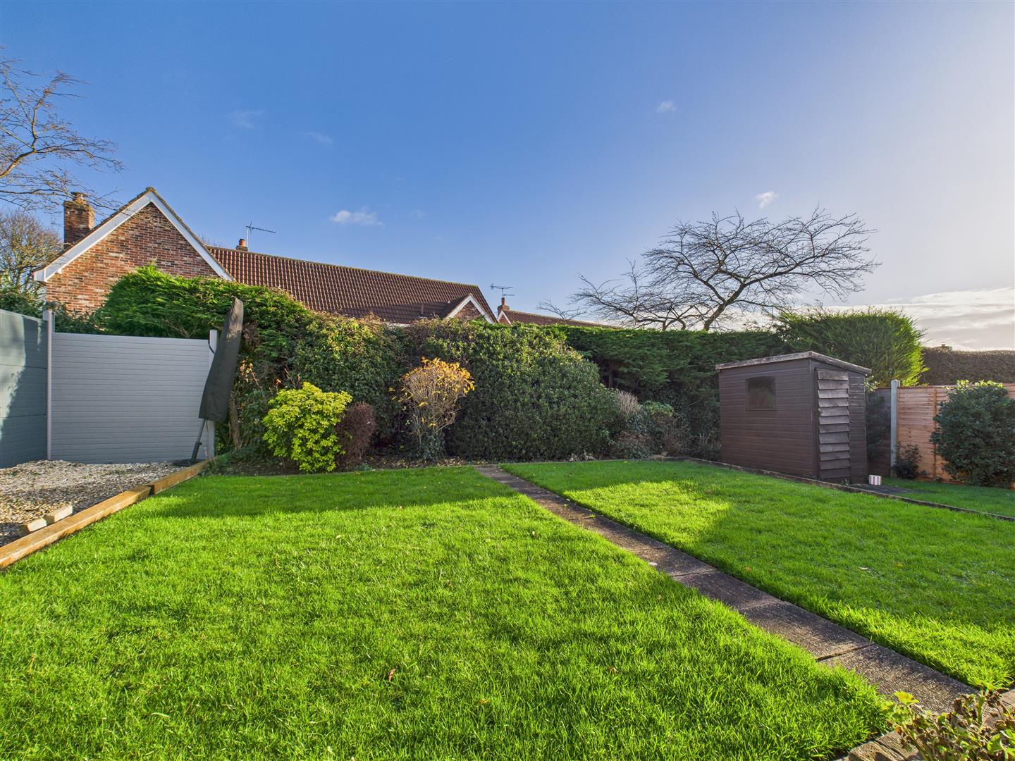 Outside - A lawned garden with a border planted with roses and shrubbery extends to the front. A side drive provides good parking and access to the single garage. To the rear lies a lawned garden with shed to one corner.