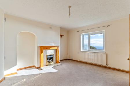 You enter the property through an initial hallway, with stairs leading to the first floor and access to the main living accommodation. To the right is the spacious living room, a bright and welcoming space that benefits from front-facing sea views, providing an attractive focal point and plenty of natural light. To the rear of the property is the kitchen, offering practical workspace and storage, along with access to a ground floor cloakroom and a door leading out to the rear garden.