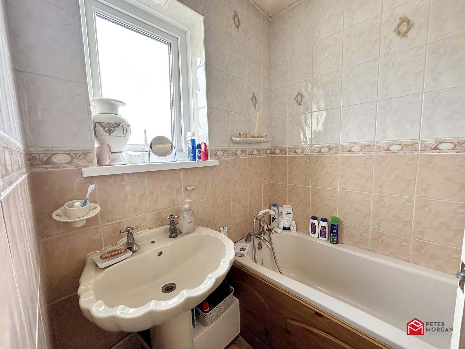 Comprising of a low level WC, wash hand basin and bath with mixer taps. uPVC Frosted double glazed window to rear aspect, fully tiled walls and tile-effect vinyl flooring.