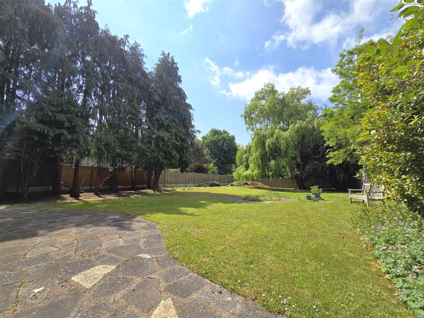 Impressively sized rear landscaped garden laid to lawn, paved patio with mature trees, display shrubbery & flower beds