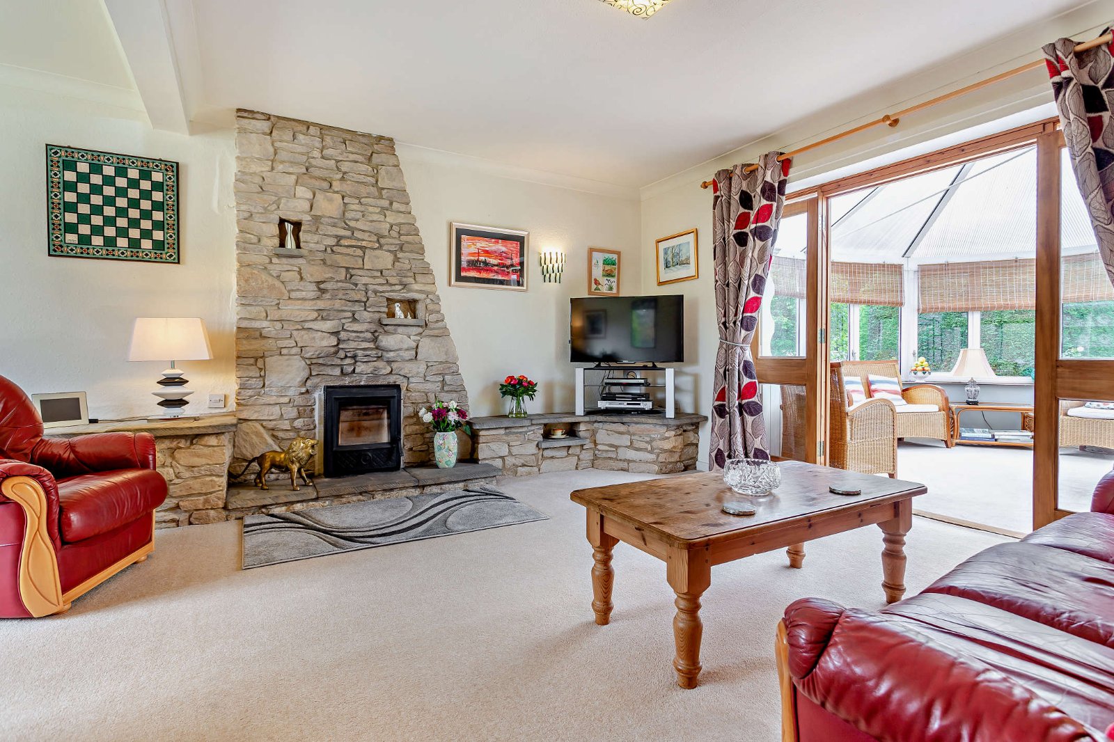 The principal reception room spans the full depth of the house, offering generous space for both living and dining areas as shown on the floorplan. A central stone fireplace with a log-burning stove makes a charming focal point and ensures warmth through the winter months.
