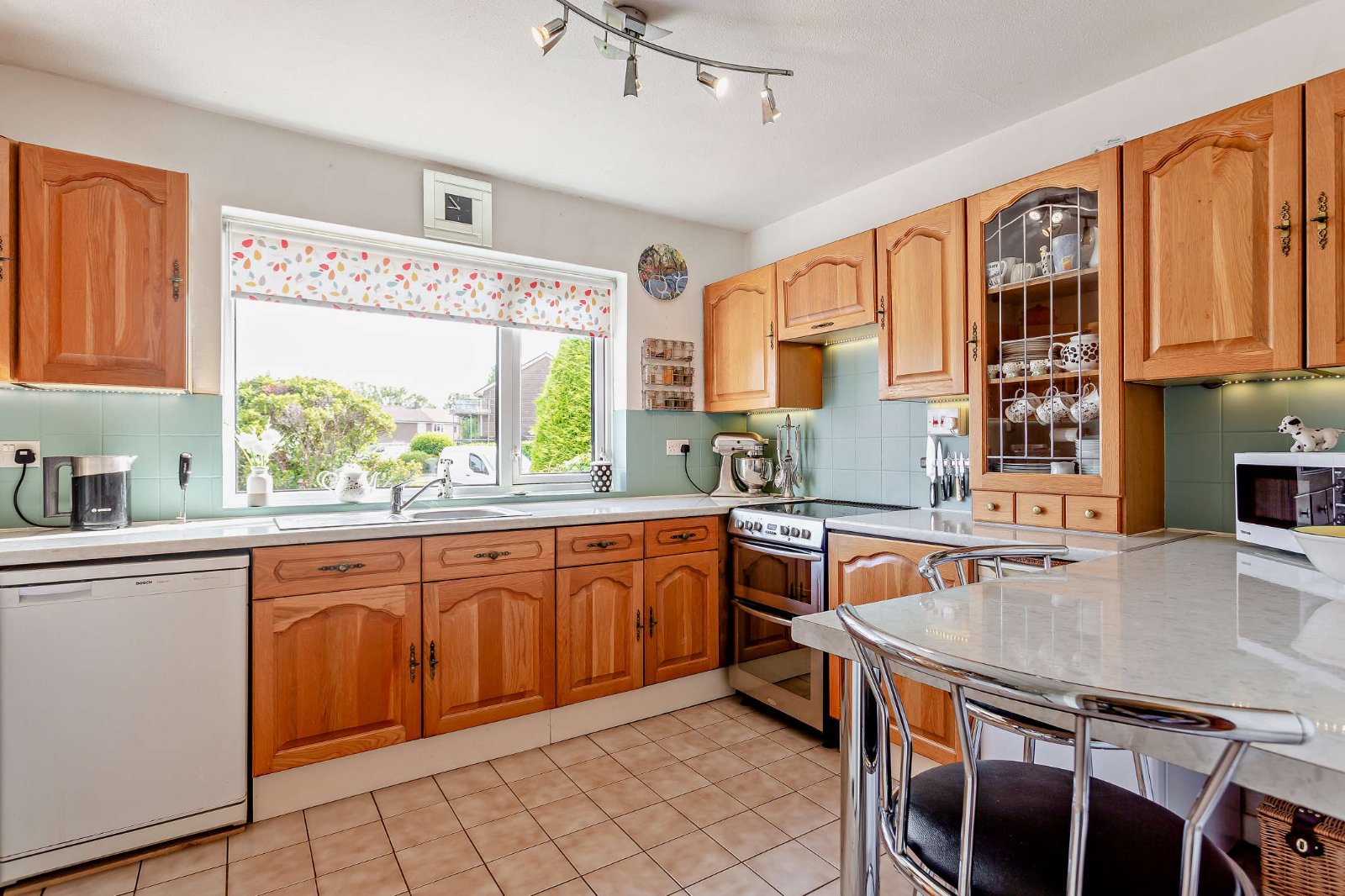 A storm porch leads you into the inner hallway, where you'll find access to a spacious and versatile layout. The kitchen sits to the front of the property, filled with natural light from a large picture window and fitted with a range of wall and base units, breakfast bar, and space for additional appliances. The oil-fired boiler is also housed here.